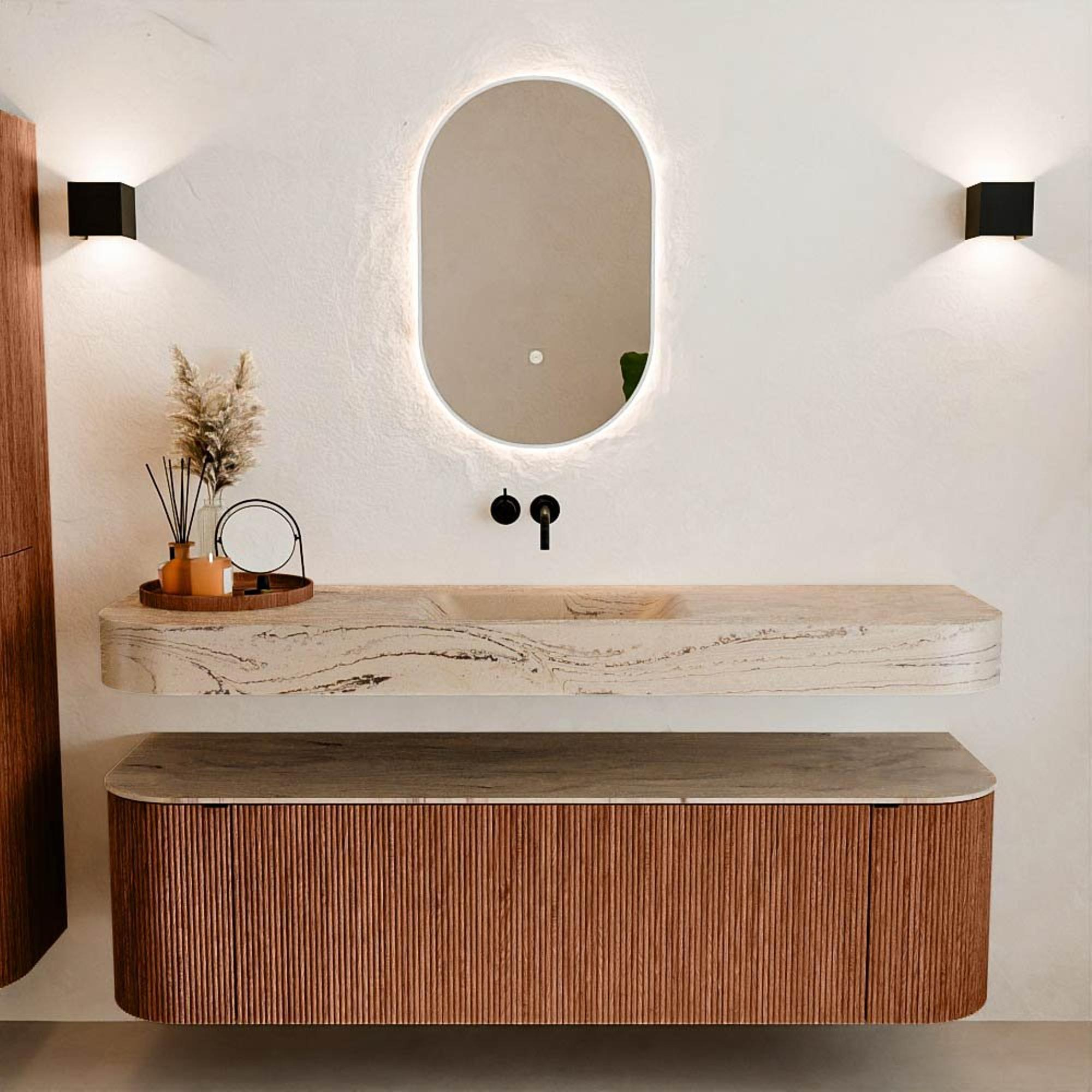 Natuurlijke materialen in warme tinten. De verticale ribbels brengen ritme en textuur in het ontwerp, terwijl het eikenhout zorgt voor een warme, ambachtelijke uitstraling. Kies uit 5 houttinten OAK, WALNUT, DUSK, SHADOW en RUBY zorgvuldig geselecteerde houtkleuren om zowel moderne als klassieke badkamers te verrijken.