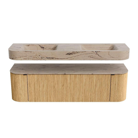 MONDIAZ THOR-DLUX 160cm badmeubel ronding links + rechts kleur Oak met 1 lade en 2 deuren. Vrijhangende wastafel CLOUD Dubbel 2 kraangaten kleur Arena.