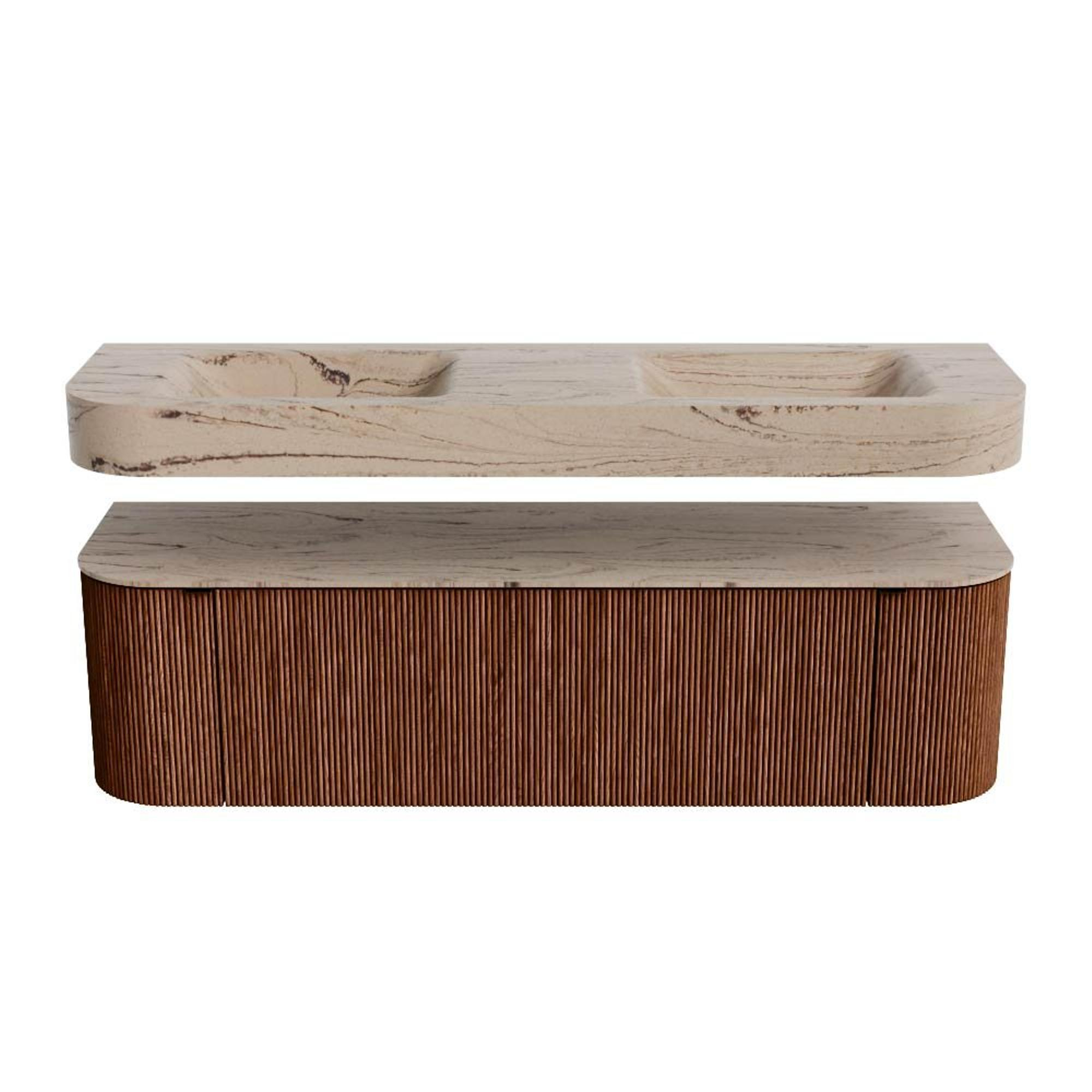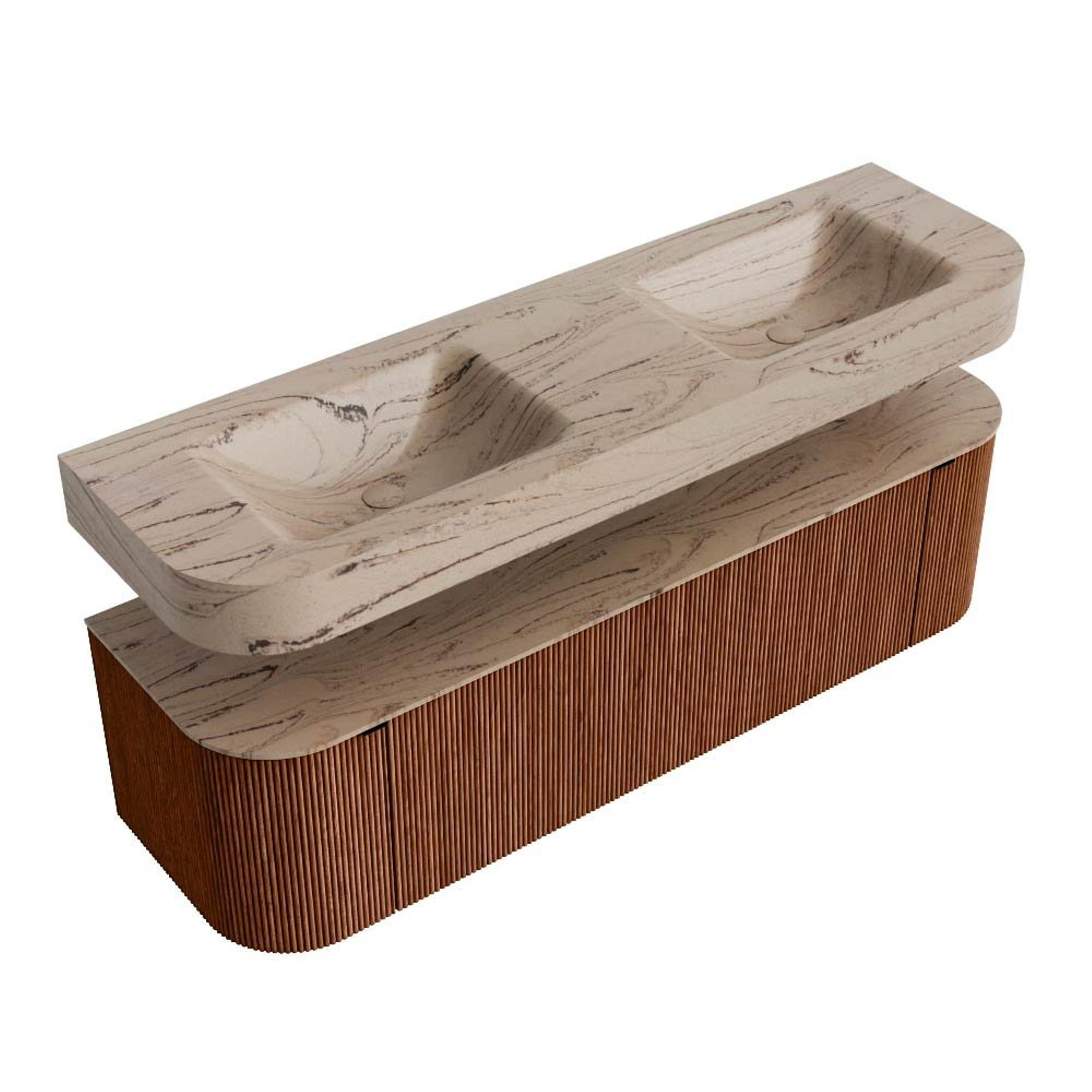 MONDIAZ THOR-DLUX 160cm badmeubel ronding links + rechts kleur Ruby met 1 lade en 2 deuren. Vrijhangende wastafel CLOUD Dubbel zonder kraangat kleur Arena.