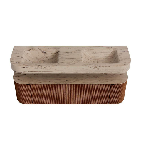 Natuurlijke materialen in warme tinten. De verticale ribbels brengen ritme en textuur in het ontwerp, terwijl het eikenhout zorgt voor een warme, ambachtelijke uitstraling. Kies uit 5 houttinten OAK, WALNUT, DUSK, SHADOW en RUBY zorgvuldig geselecteerde houtkleuren om zowel moderne als klassieke badkamers te verrijken.