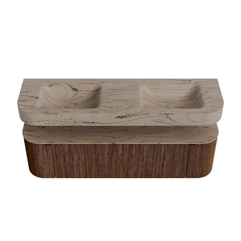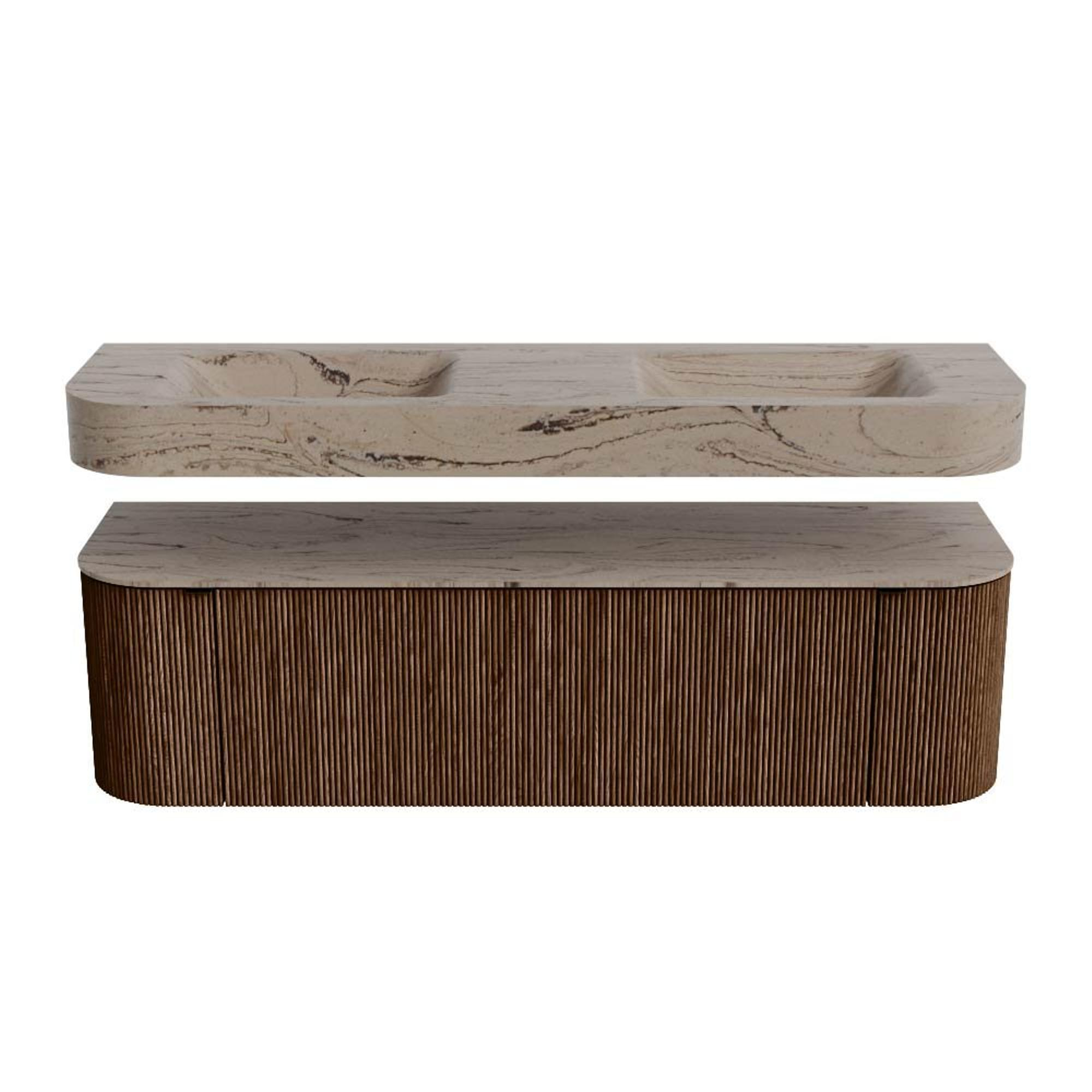 MONDIAZ THOR-DLUX 160cm badmeubel ronding links + rechts kleur Walnut met 1 lade en 2 deuren. Vrijhangende wastafel CLOUD Dubbel 2 kraangaten kleur Arena.