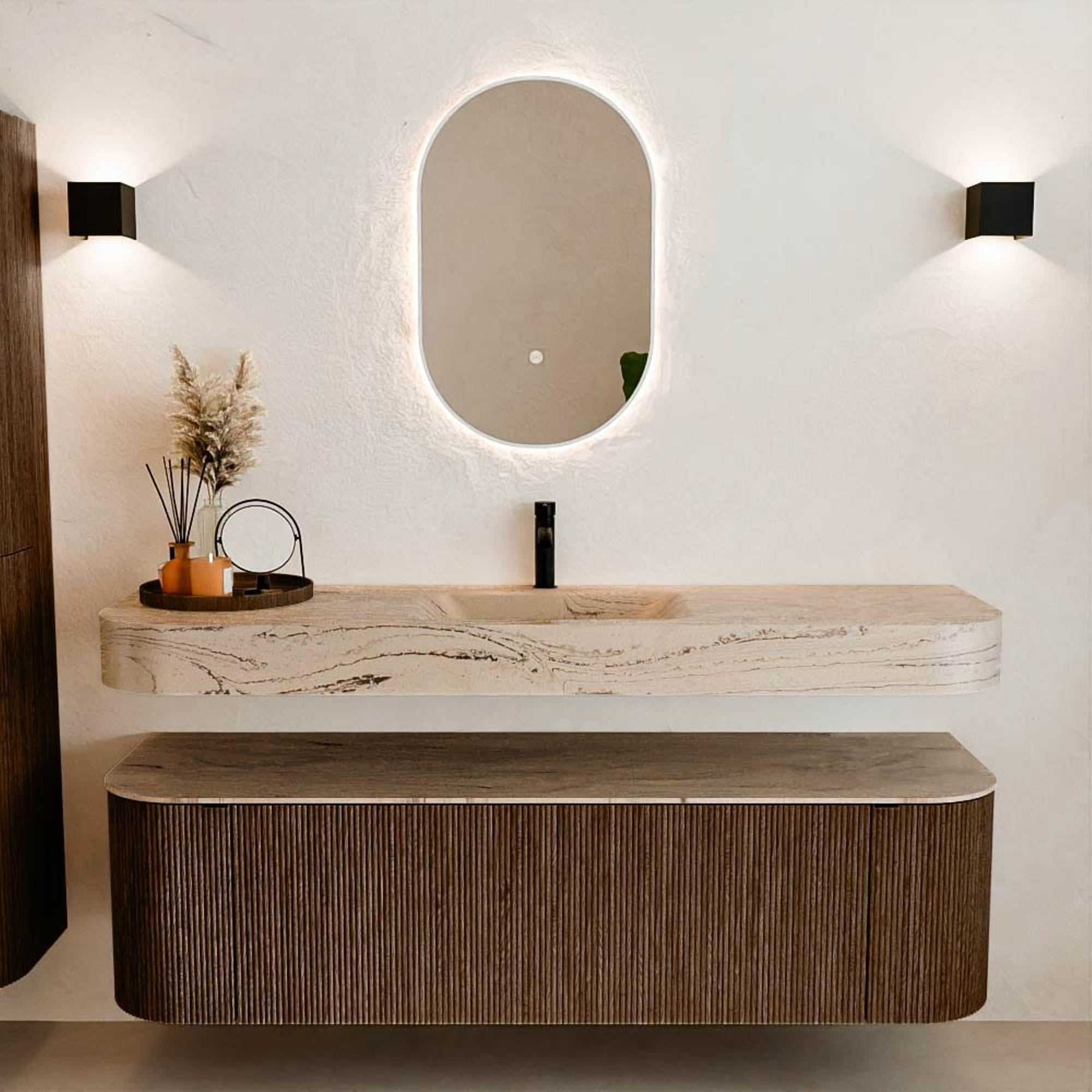 Natuurlijke materialen in warme tinten. De verticale ribbels brengen ritme en textuur in het ontwerp, terwijl het eikenhout zorgt voor een warme, ambachtelijke uitstraling. Kies uit 5 houttinten OAK, WALNUT, DUSK, SHADOW en RUBY zorgvuldig geselecteerde houtkleuren om zowel moderne als klassieke badkamers te verrijken.