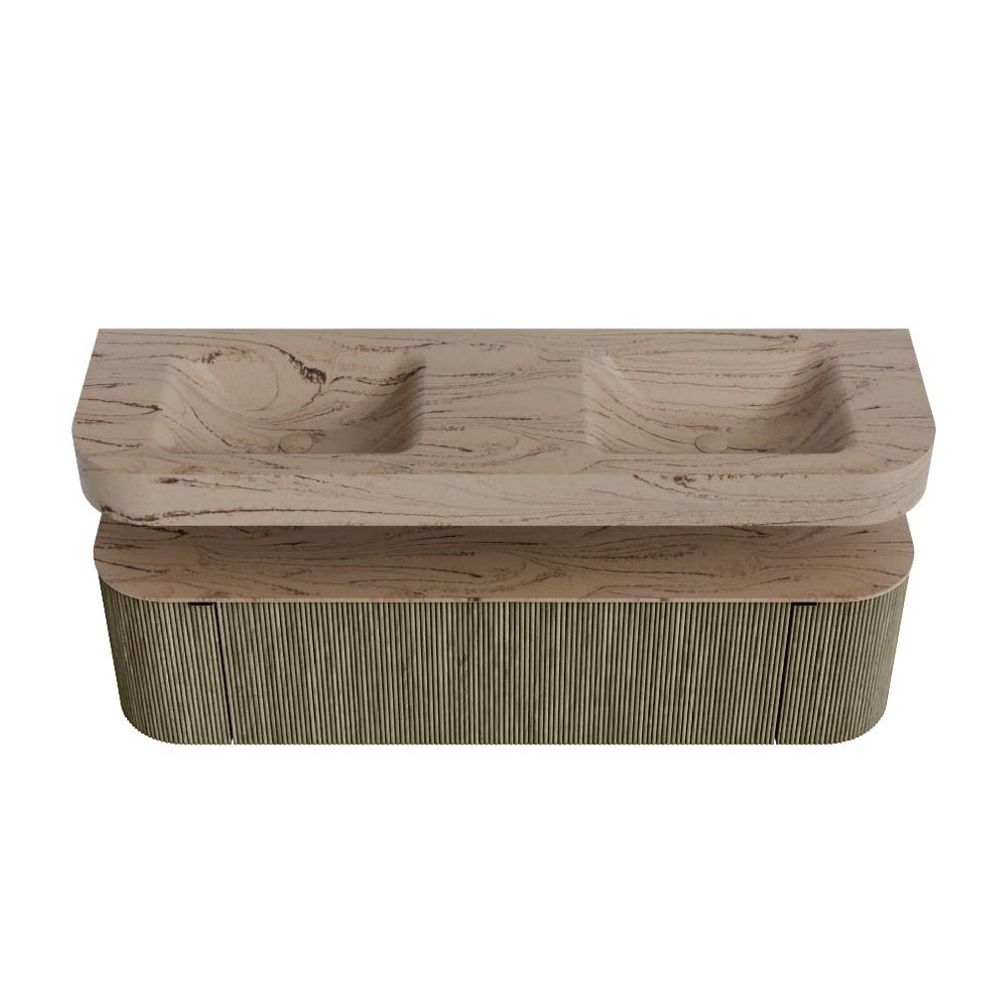 Boven het meubel zweeft een bijpassende, vrij hangende wastafel met afgeronde hoeken – perfect afgestemd op de vorm van de kast. De wastafel is uitgevoerd in Solid Surface en volgt subtiel de lijnen van het onderliggende meubel, waardoor een harmonieus geheel ontstaat. Het Solid Surface topblad vormt een sterke, onderhoudsvriendelijke basis en maakt de combinatie compleet.