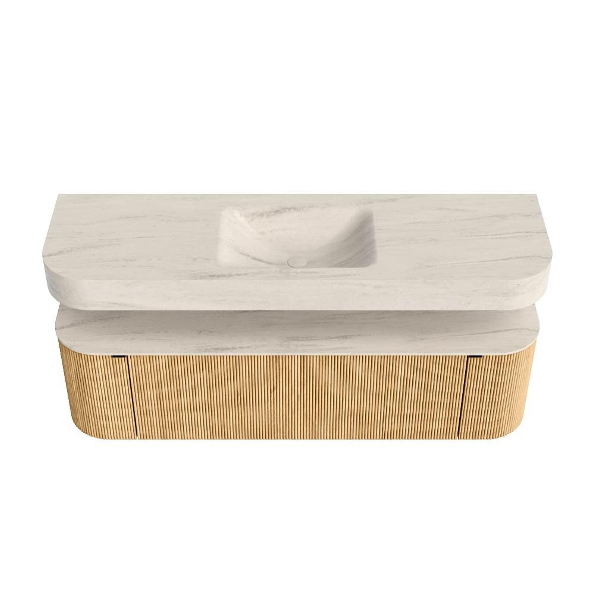 Boven het meubel zweeft een bijpassende, vrij hangende wastafel met afgeronde hoeken – perfect afgestemd op de vorm van de kast. De wastafel is uitgevoerd in Solid Surface en volgt subtiel de lijnen van het onderliggende meubel, waardoor een harmonieus geheel ontstaat. Het Solid Surface topblad vormt een sterke, onderhoudsvriendelijke basis en maakt de combinatie compleet.