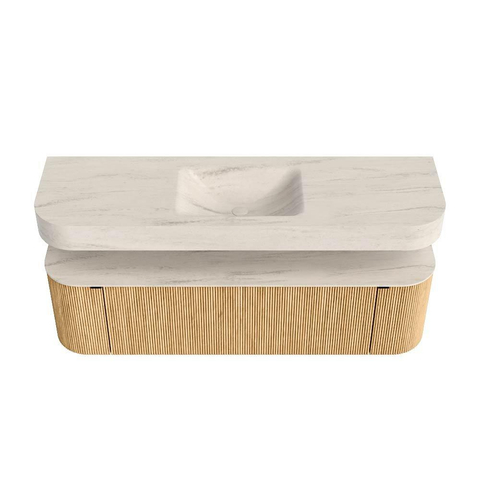MONDIAZ THOR-DLUX 160cm badmeubel ronding links + rechts kleur Oak met 1 lade en 2 deuren. Vrijhangende wastafel CLOUD Midden 1 kraangat kleur Meli.