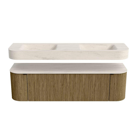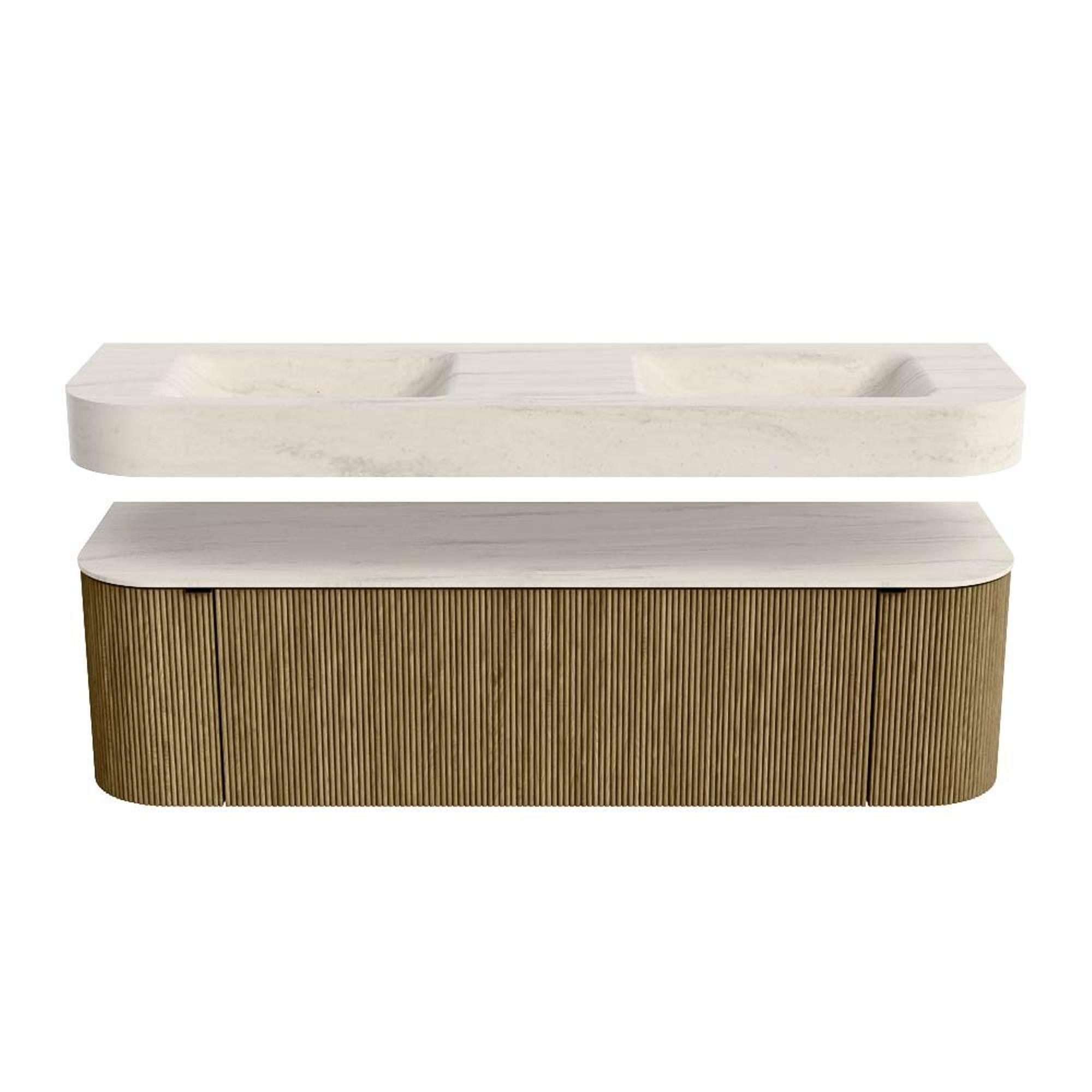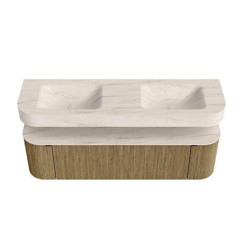 Boven het meubel zweeft een bijpassende, vrij hangende wastafel met afgeronde hoeken – perfect afgestemd op de vorm van de kast. De wastafel is uitgevoerd in Solid Surface en volgt subtiel de lijnen van het onderliggende meubel, waardoor een harmonieus geheel ontstaat. Het Solid Surface topblad vormt een sterke, onderhoudsvriendelijke basis en maakt de combinatie compleet.