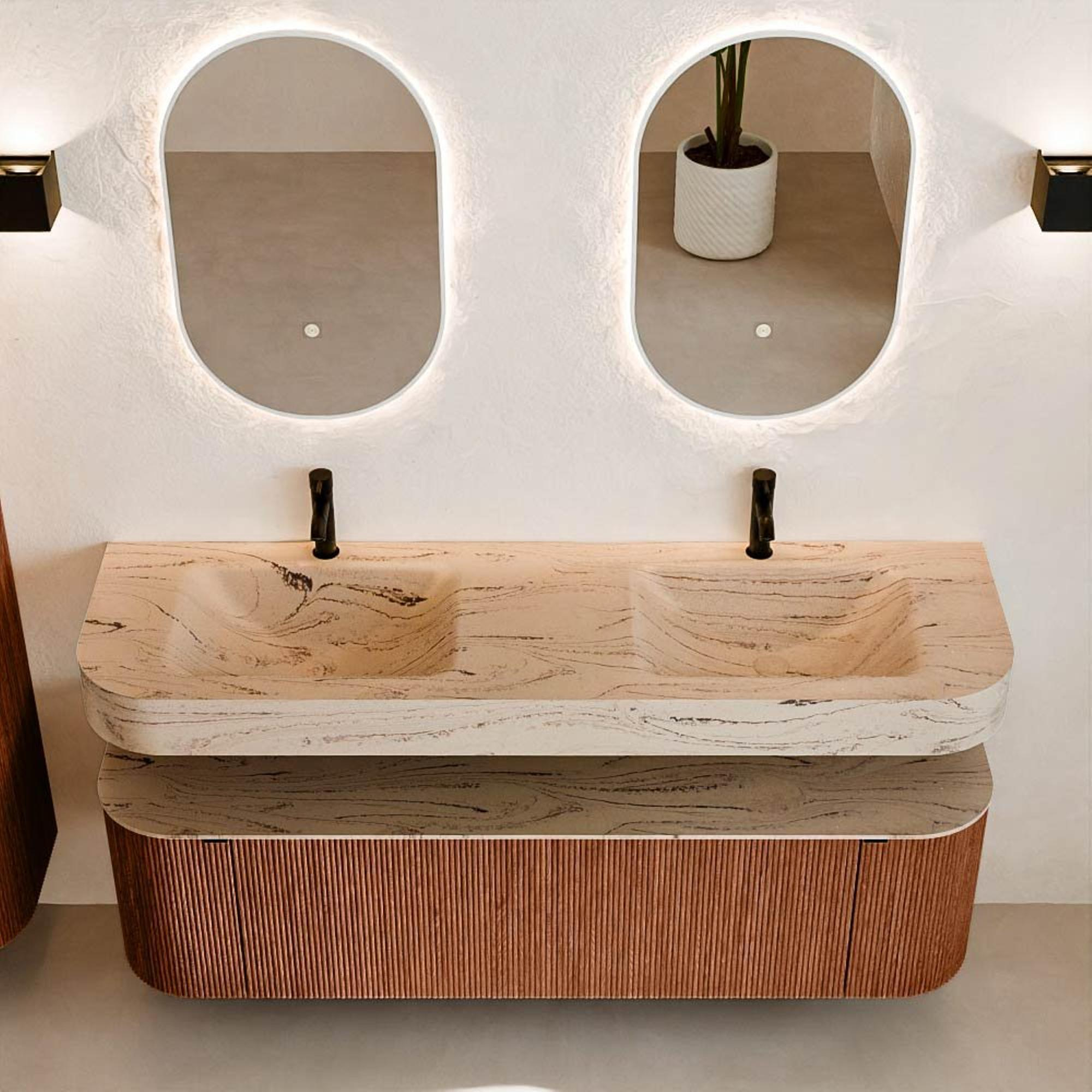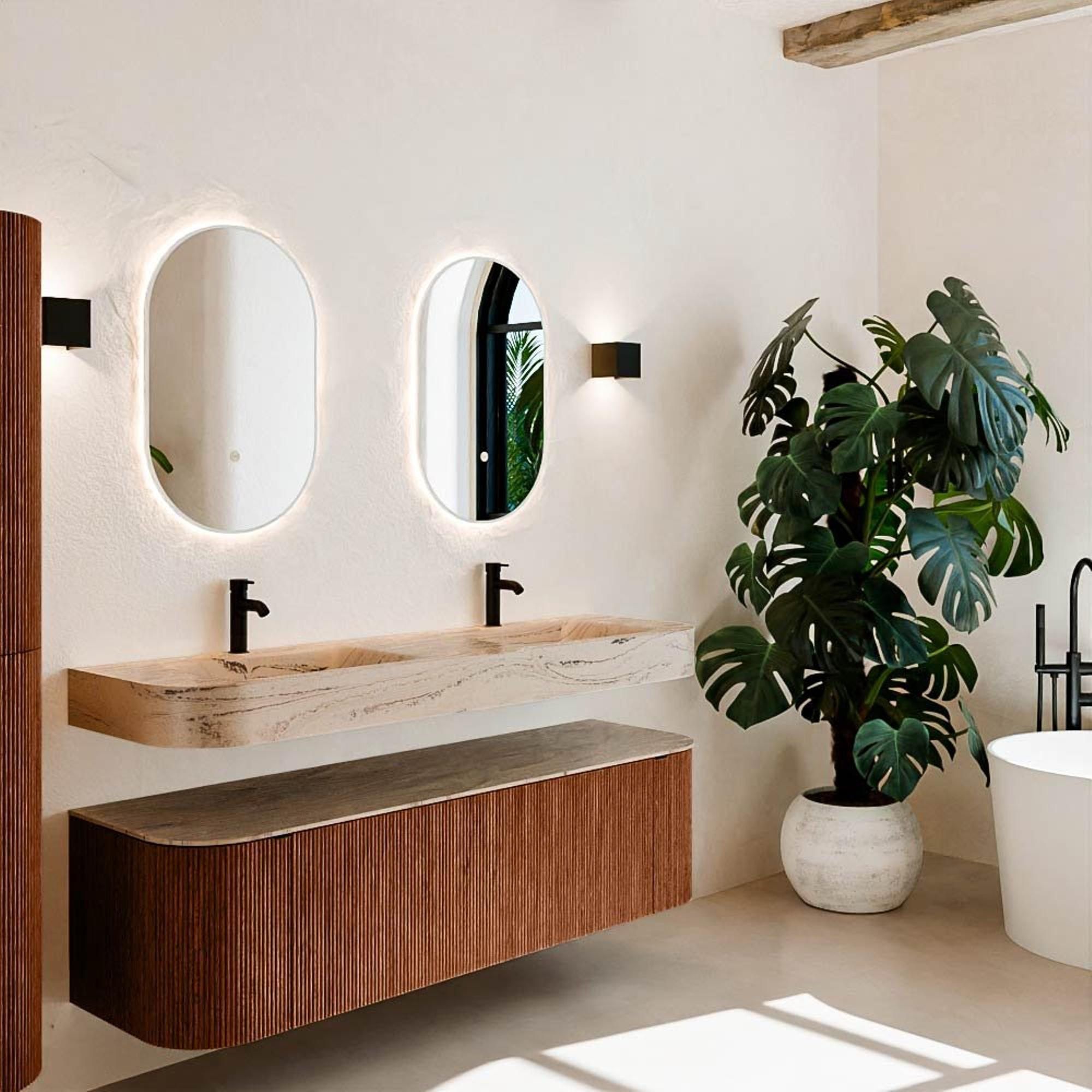 Natuurlijke materialen in warme tinten. De verticale ribbels brengen ritme en textuur in het ontwerp, terwijl het eikenhout zorgt voor een warme, ambachtelijke uitstraling. Kies uit 5 houttinten OAK, WALNUT, DUSK, SHADOW en RUBY zorgvuldig geselecteerde houtkleuren om zowel moderne als klassieke badkamers te verrijken.