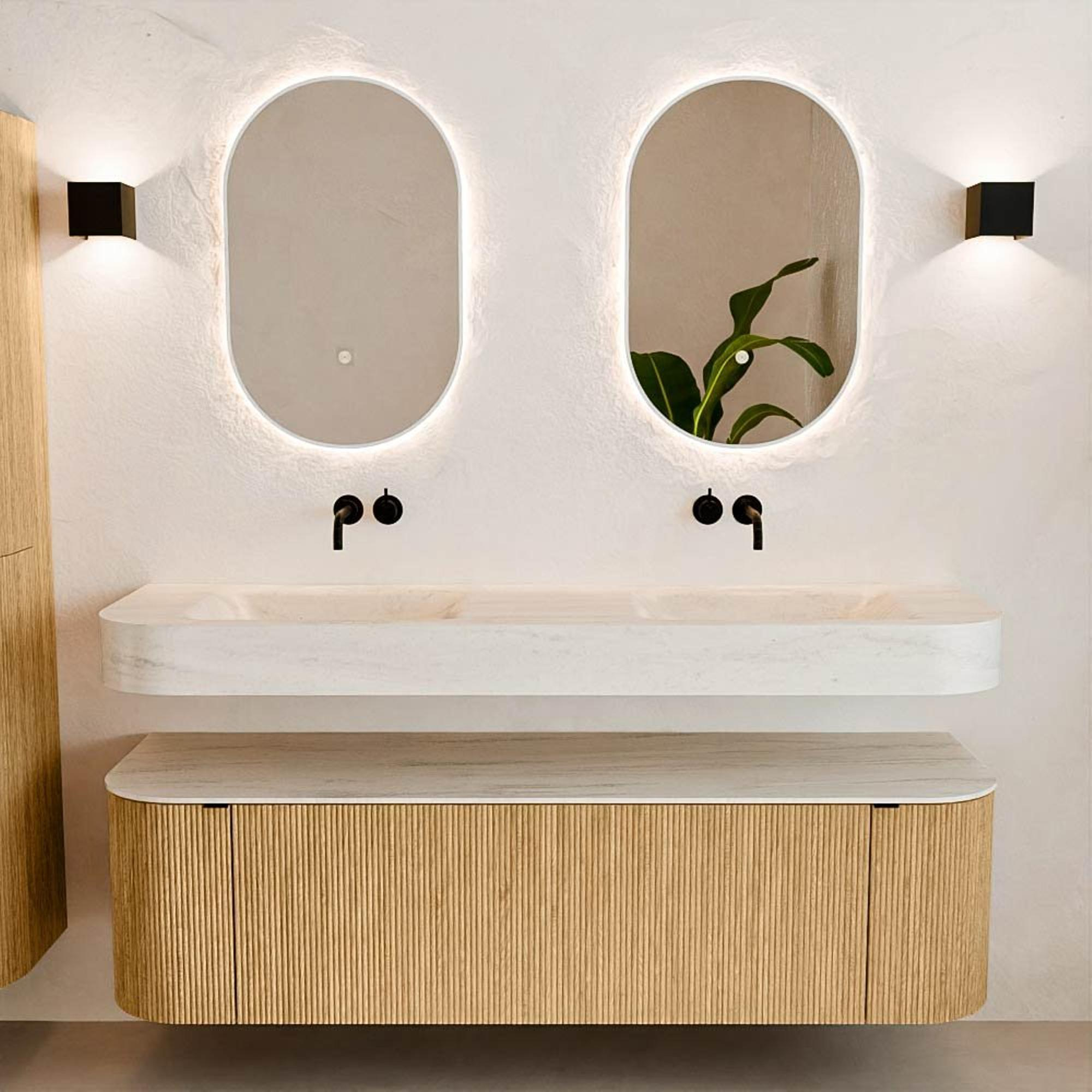 Natuurlijke materialen in warme tinten. De verticale ribbels brengen ritme en textuur in het ontwerp, terwijl het eikenhout zorgt voor een warme, ambachtelijke uitstraling. Kies uit 5 houttinten OAK, WALNUT, DUSK, SHADOW en RUBY zorgvuldig geselecteerde houtkleuren om zowel moderne als klassieke badkamers te verrijken.