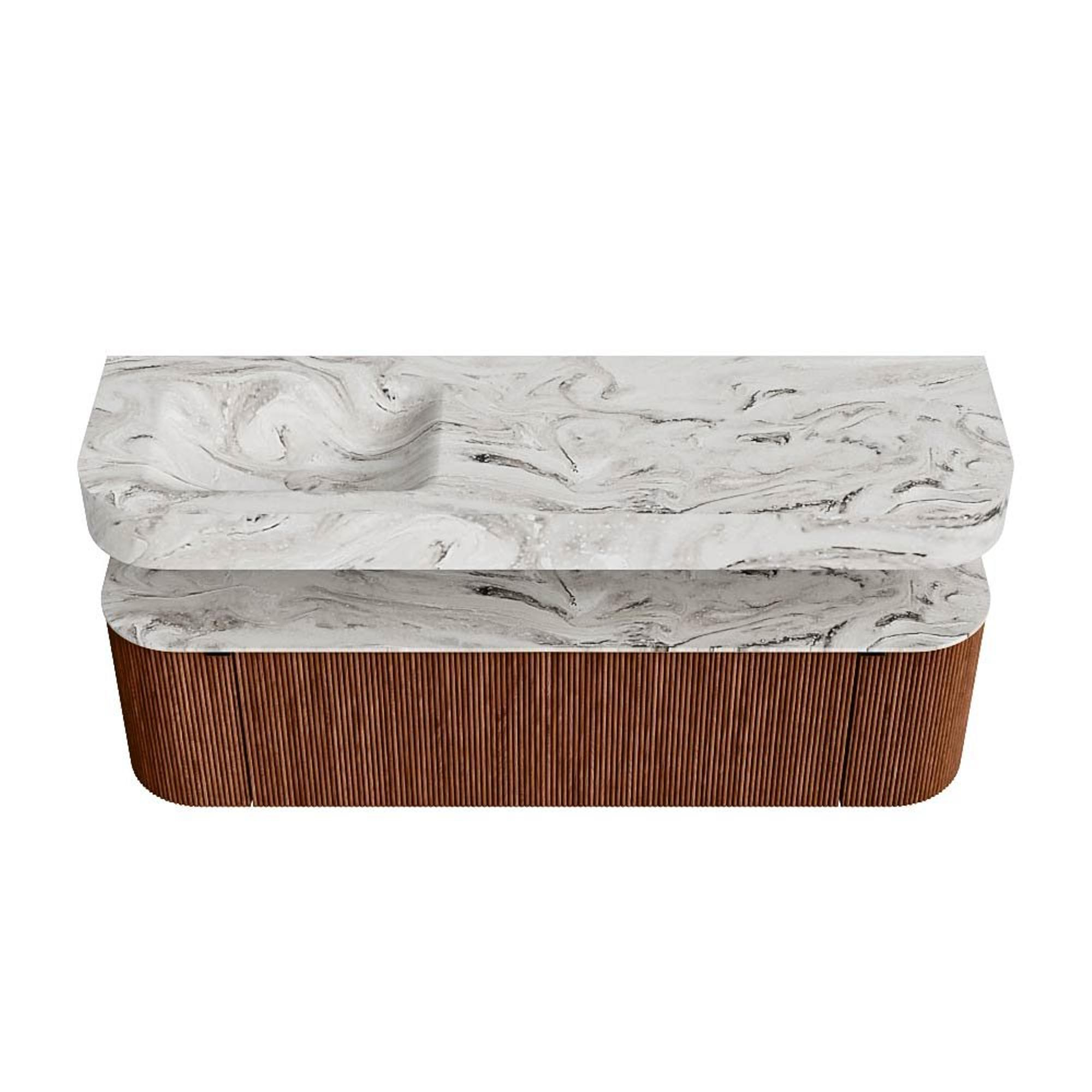 MONDIAZ THOR-DLUX 160cm badmeubel ronding links + rechts kleur Ruby met 1 lade en 2 deuren. Vrijhangende wastafel CLOUD Links zonder kraangat kleur Glace.