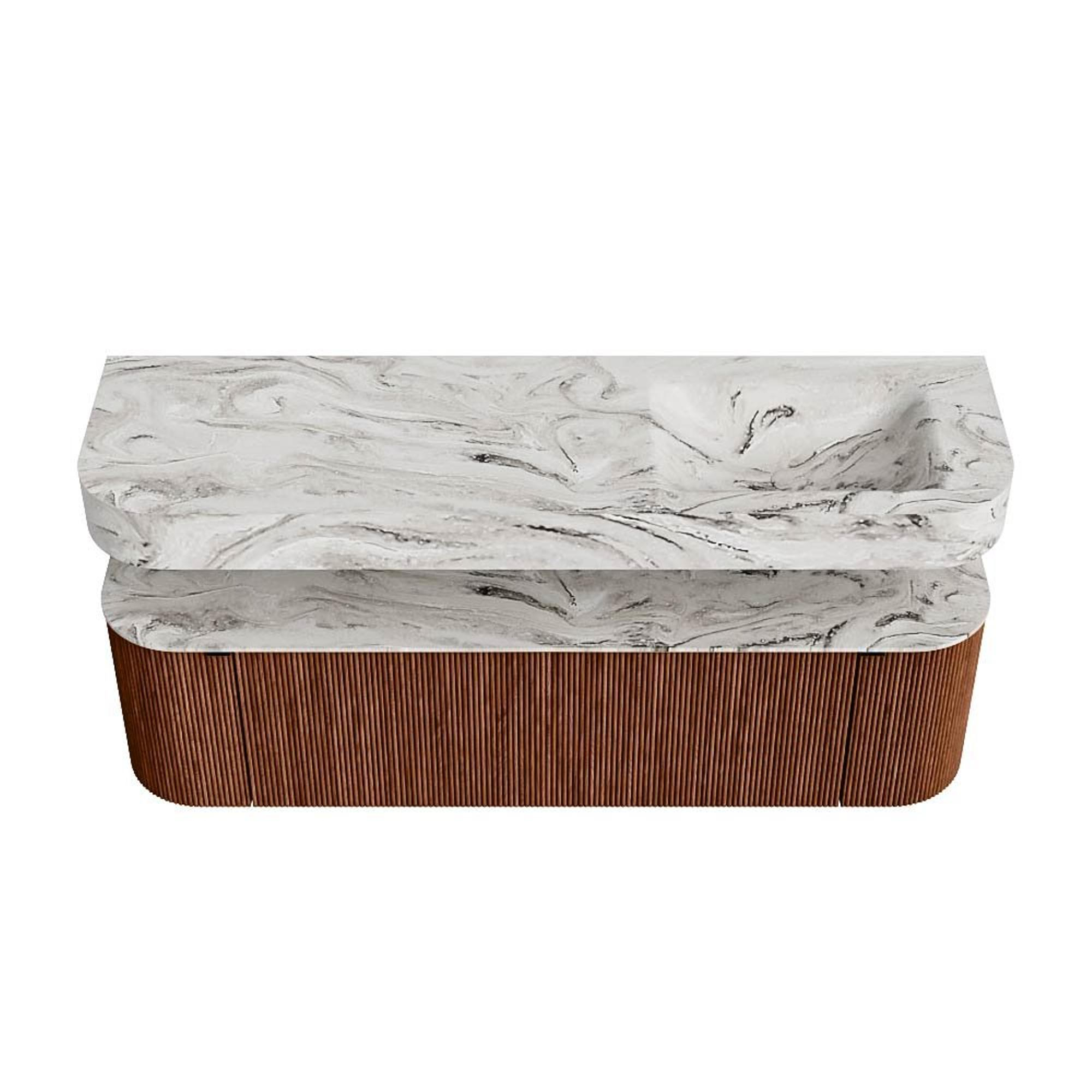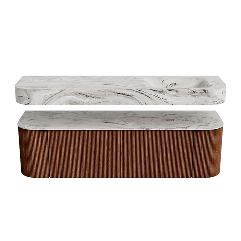 Boven het meubel zweeft een bijpassende, vrij hangende wastafel met afgeronde hoeken – perfect afgestemd op de vorm van de kast. De wastafel is uitgevoerd in Solid Surface en volgt subtiel de lijnen van het onderliggende meubel, waardoor een harmonieus geheel ontstaat. Het Solid Surface topblad vormt een sterke, onderhoudsvriendelijke basis en maakt de combinatie compleet.