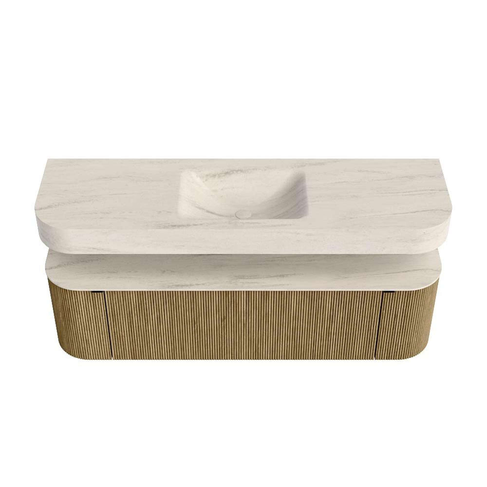Boven het meubel zweeft een bijpassende, vrij hangende wastafel met afgeronde hoeken – perfect afgestemd op de vorm van de kast. De wastafel is uitgevoerd in Solid Surface en volgt subtiel de lijnen van het onderliggende meubel, waardoor een harmonieus geheel ontstaat. Het Solid Surface topblad vormt een sterke, onderhoudsvriendelijke basis en maakt de combinatie compleet.