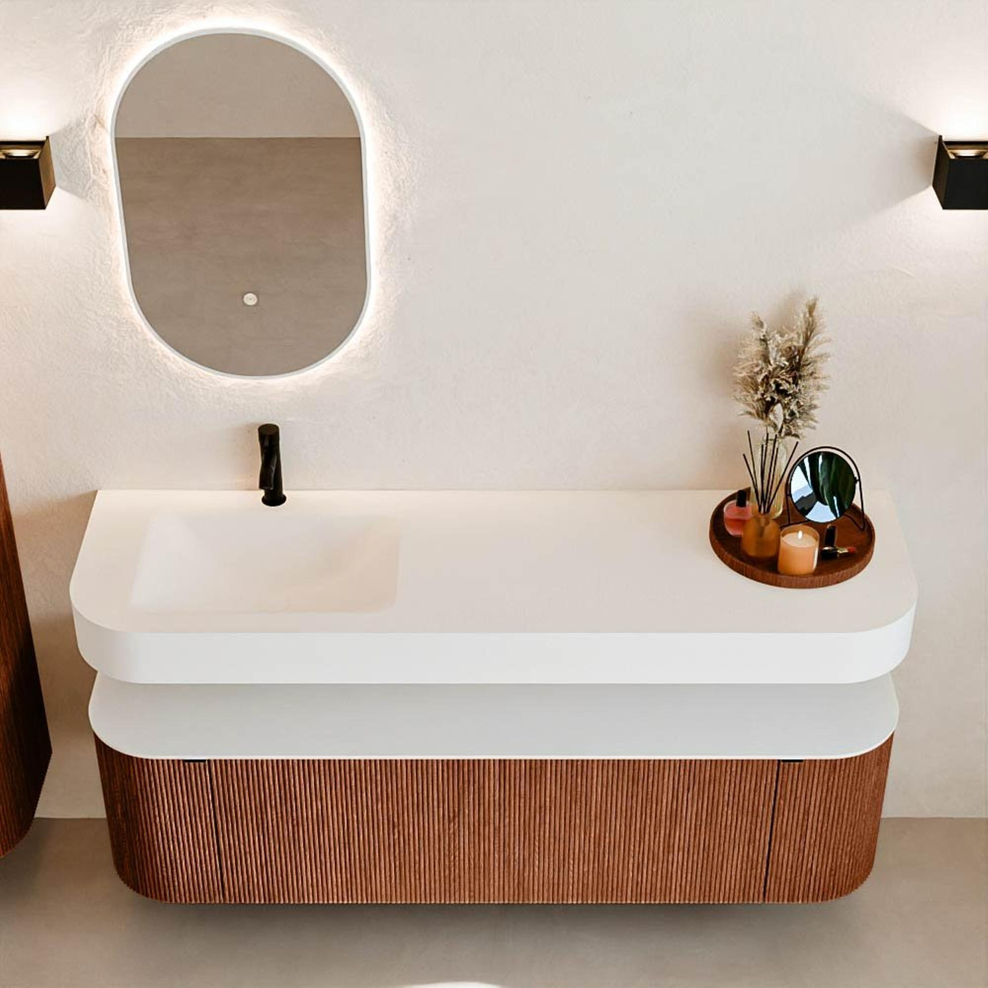 Boven het meubel zweeft een bijpassende, vrij hangende wastafel met afgeronde hoeken – perfect afgestemd op de vorm van de kast. De wastafel is uitgevoerd in Solid Surface en volgt subtiel de lijnen van het onderliggende meubel, waardoor een harmonieus geheel ontstaat. Het Solid Surface topblad vormt een sterke, onderhoudsvriendelijke basis en maakt de combinatie compleet.