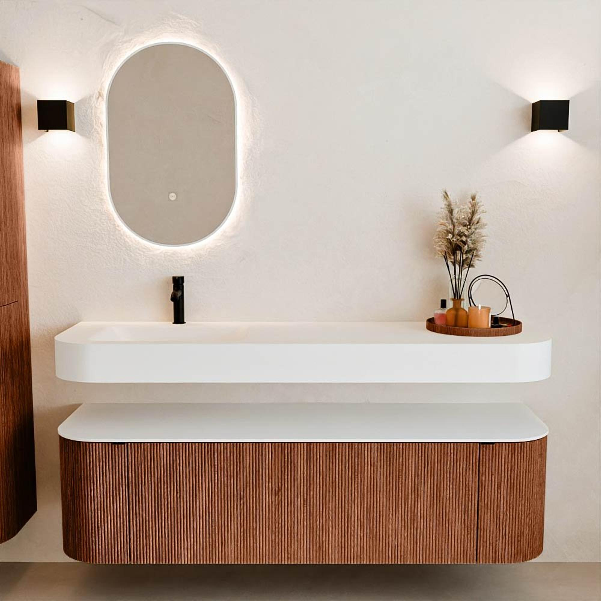 Natuurlijke materialen in warme tinten. De verticale ribbels brengen ritme en textuur in het ontwerp, terwijl het eikenhout zorgt voor een warme, ambachtelijke uitstraling. Kies uit 5 houttinten OAK, WALNUT, DUSK, SHADOW en RUBY zorgvuldig geselecteerde houtkleuren om zowel moderne als klassieke badkamers te verrijken.