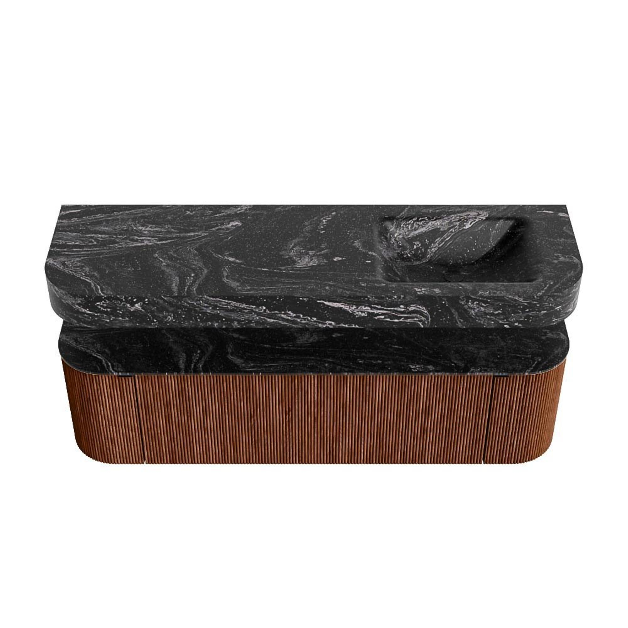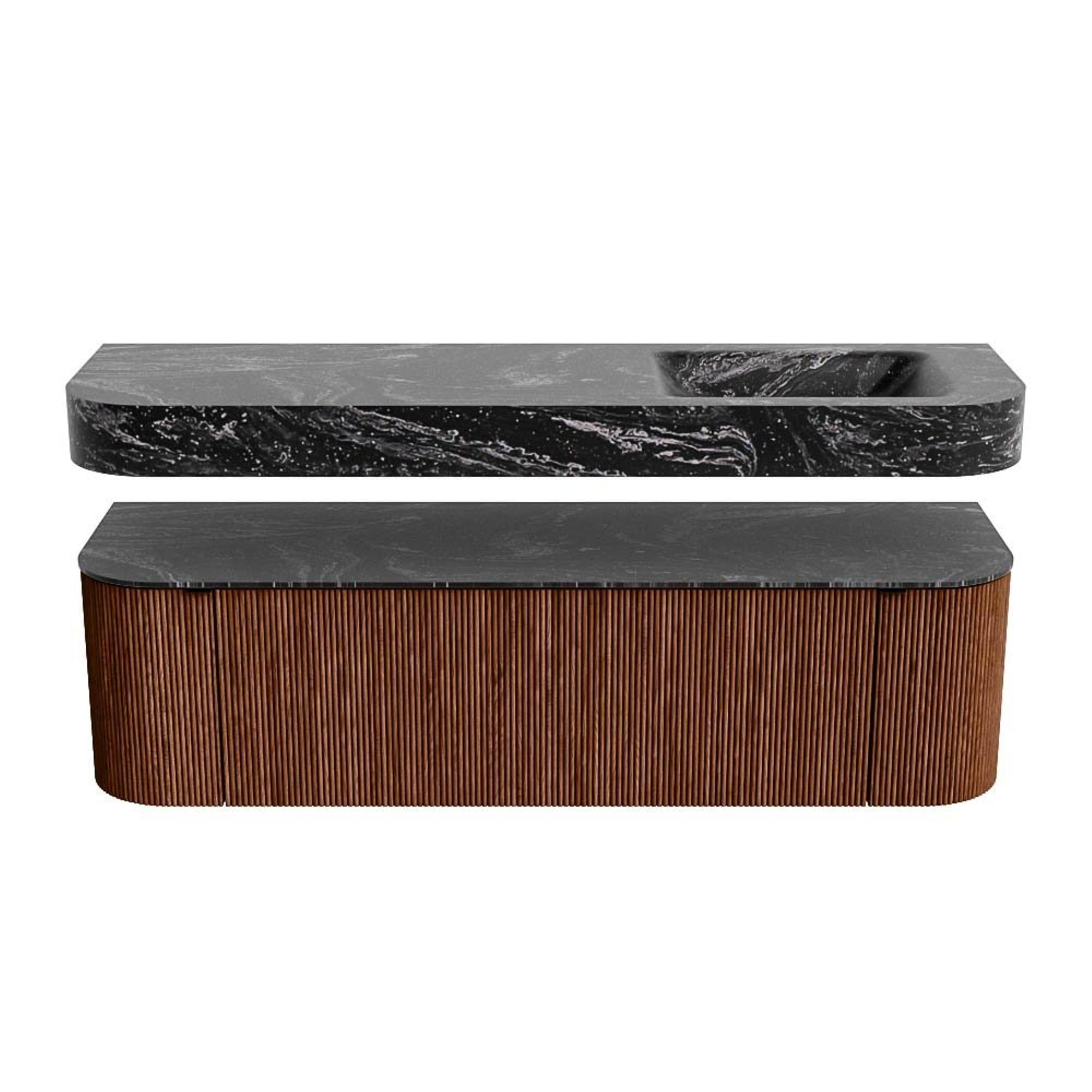 MONDIAZ THOR-DLUX 160cm badmeubel ronding links + rechts kleur Ruby met 1 lade en 2 deuren. Vrijhangende wastafel CLOUD Rechts zonder kraangat kleur Lava.