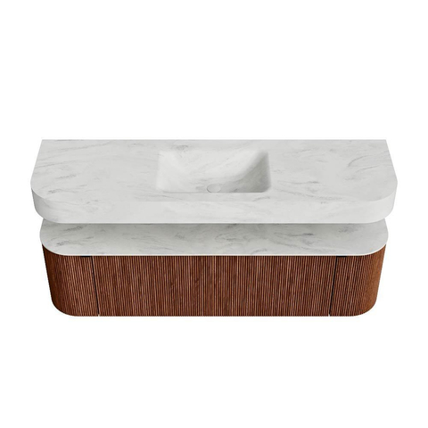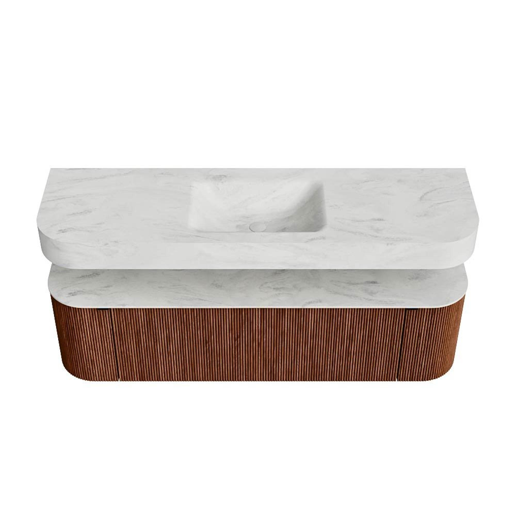 Boven het meubel zweeft een bijpassende, vrij hangende wastafel met afgeronde hoeken – perfect afgestemd op de vorm van de kast. De wastafel is uitgevoerd in Solid Surface en volgt subtiel de lijnen van het onderliggende meubel, waardoor een harmonieus geheel ontstaat. Het Solid Surface topblad vormt een sterke, onderhoudsvriendelijke basis en maakt de combinatie compleet.
