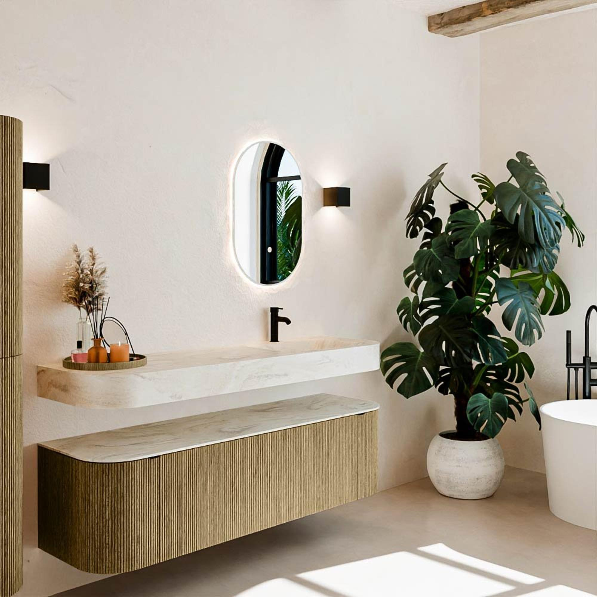 Natuurlijke materialen in warme tinten. De verticale ribbels brengen ritme en textuur in het ontwerp, terwijl het eikenhout zorgt voor een warme, ambachtelijke uitstraling. Kies uit 5 houttinten OAK, WALNUT, DUSK, SHADOW en RUBY zorgvuldig geselecteerde houtkleuren om zowel moderne als klassieke badkamers te verrijken.
