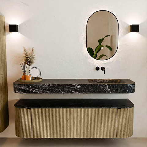 Natuurlijke materialen in warme tinten. De verticale ribbels brengen ritme en textuur in het ontwerp, terwijl het eikenhout zorgt voor een warme, ambachtelijke uitstraling. Kies uit 5 houttinten OAK, WALNUT, DUSK, SHADOW en RUBY zorgvuldig geselecteerde houtkleuren om zowel moderne als klassieke badkamers te verrijken.