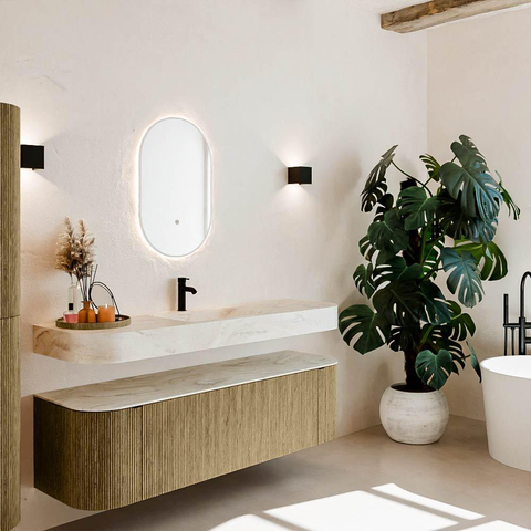 Natuurlijke materialen in warme tinten. De verticale ribbels brengen ritme en textuur in het ontwerp, terwijl het eikenhout zorgt voor een warme, ambachtelijke uitstraling. Kies uit 5 houttinten OAK, WALNUT, DUSK, SHADOW en RUBY zorgvuldig geselecteerde houtkleuren om zowel moderne als klassieke badkamers te verrijken.
