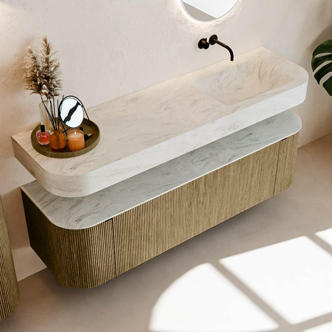 Boven het meubel zweeft een bijpassende, vrij hangende wastafel met afgeronde hoeken – perfect afgestemd op de vorm van de kast. De wastafel is uitgevoerd in Solid Surface en volgt subtiel de lijnen van het onderliggende meubel, waardoor een harmonieus geheel ontstaat. Het Solid Surface topblad vormt een sterke, onderhoudsvriendelijke basis en maakt de combinatie compleet.