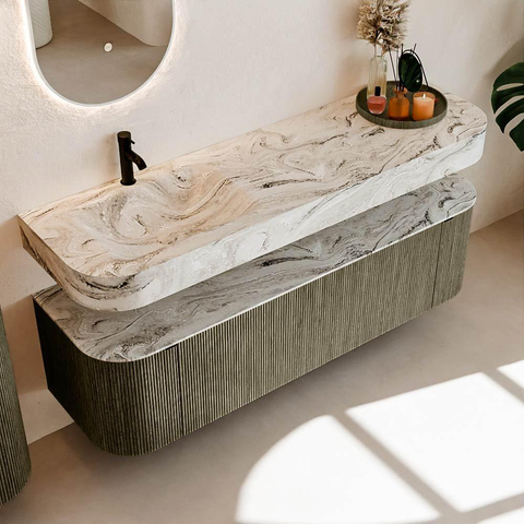 Boven het meubel zweeft een bijpassende, vrij hangende wastafel met afgeronde hoeken – perfect afgestemd op de vorm van de kast. De wastafel is uitgevoerd in Solid Surface en volgt subtiel de lijnen van het onderliggende meubel, waardoor een harmonieus geheel ontstaat. Het Solid Surface topblad vormt een sterke, onderhoudsvriendelijke basis en maakt de combinatie compleet.