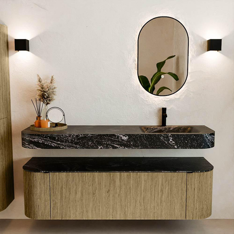 Natuurlijke materialen in warme tinten. De verticale ribbels brengen ritme en textuur in het ontwerp, terwijl het eikenhout zorgt voor een warme, ambachtelijke uitstraling. Kies uit 5 houttinten OAK, WALNUT, DUSK, SHADOW en RUBY zorgvuldig geselecteerde houtkleuren om zowel moderne als klassieke badkamers te verrijken.