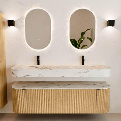 Natuurlijke materialen in warme tinten. De verticale ribbels brengen ritme en textuur in het ontwerp, terwijl het eikenhout zorgt voor een warme, ambachtelijke uitstraling. Kies uit 5 houttinten OAK, WALNUT, DUSK, SHADOW en RUBY zorgvuldig geselecteerde houtkleuren om zowel moderne als klassieke badkamers te verrijken.
