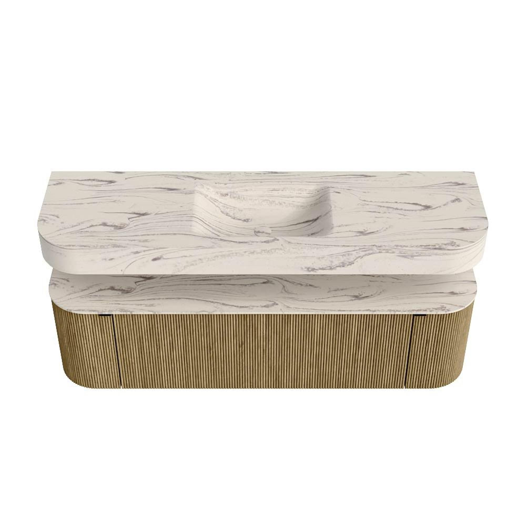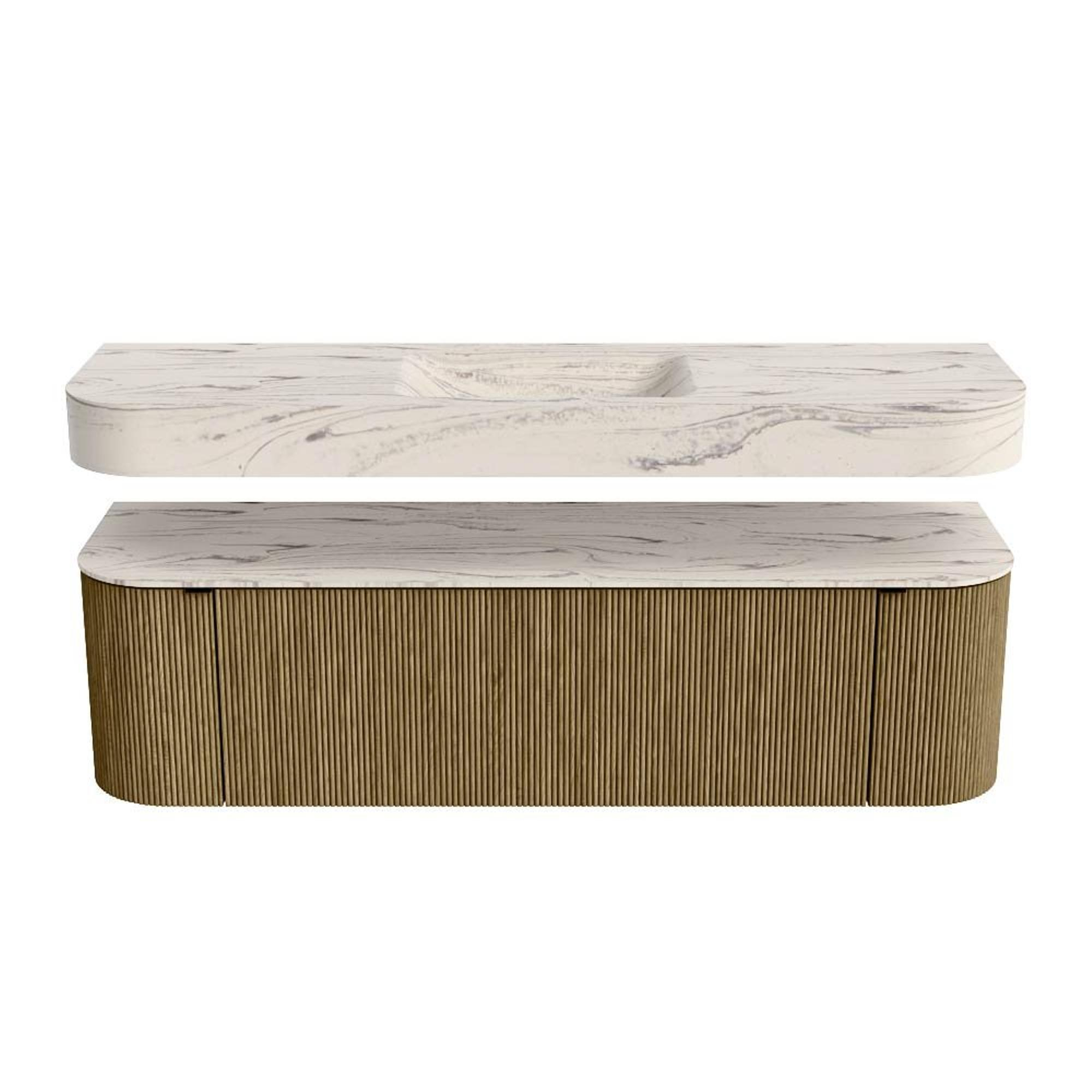 Boven het meubel zweeft een bijpassende, vrij hangende wastafel met afgeronde hoeken – perfect afgestemd op de vorm van de kast. De wastafel is uitgevoerd in Solid Surface en volgt subtiel de lijnen van het onderliggende meubel, waardoor een harmonieus geheel ontstaat. Het Solid Surface topblad vormt een sterke, onderhoudsvriendelijke basis en maakt de combinatie compleet.