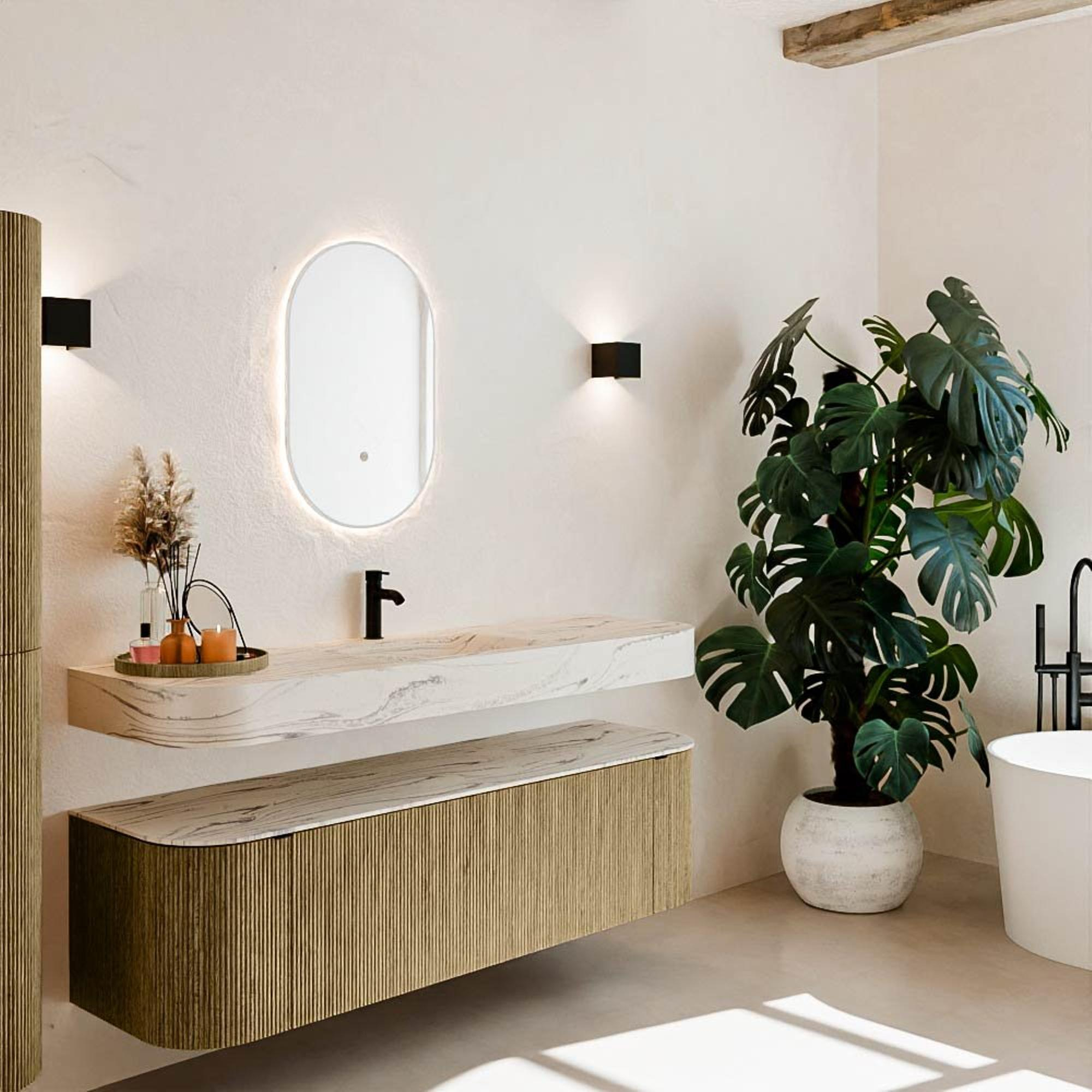 Natuurlijke materialen in warme tinten. De verticale ribbels brengen ritme en textuur in het ontwerp, terwijl het eikenhout zorgt voor een warme, ambachtelijke uitstraling. Kies uit 5 houttinten OAK, WALNUT, DUSK, SHADOW en RUBY zorgvuldig geselecteerde houtkleuren om zowel moderne als klassieke badkamers te verrijken.