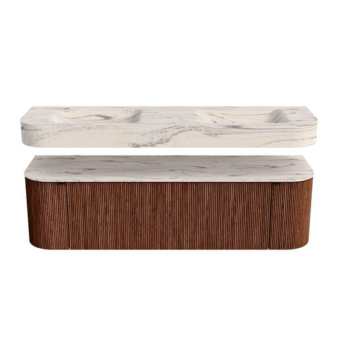 MONDIAZ THOR-DLUX 160cm badmeubel ronding links + rechts kleur Ruby met 1 lade en 2 deuren. Vrijhangende wastafel CLOUD Dubbel 2 kraangaten kleur Nata.