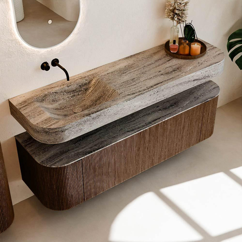 Natuurlijke materialen in warme tinten. De verticale ribbels brengen ritme en textuur in het ontwerp, terwijl het eikenhout zorgt voor een warme, ambachtelijke uitstraling. Kies uit 5 houttinten OAK, WALNUT, DUSK, SHADOW en RUBY zorgvuldig geselecteerde houtkleuren om zowel moderne als klassieke badkamers te verrijken.