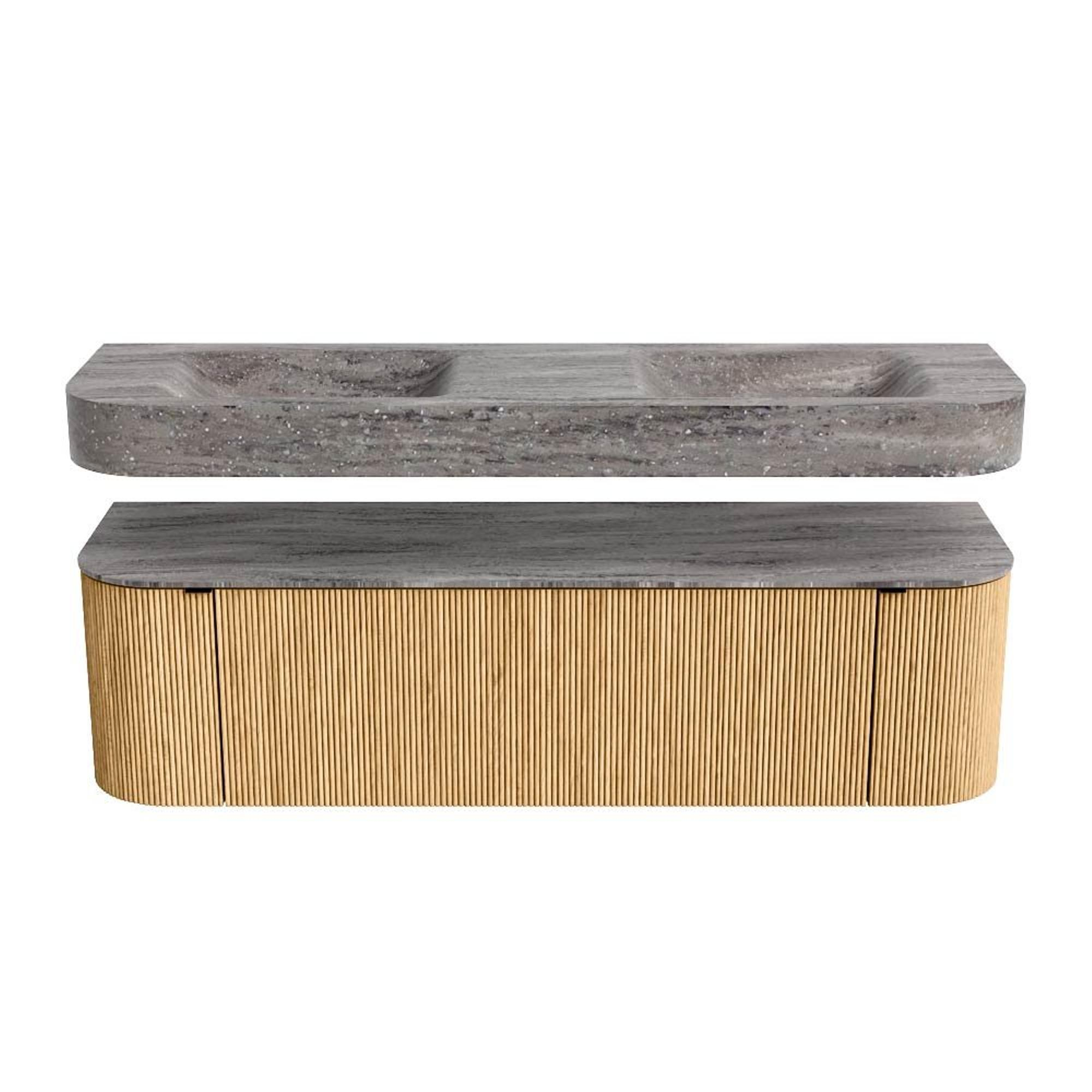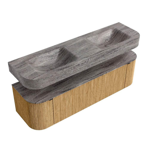 MONDIAZ THOR-DLUX 160cm badmeubel ronding links + rechts kleur Oak met 1 lade en 2 deuren. Vrijhangende wastafel CLOUD Dubbel 2 kraangaten kleur Oza.