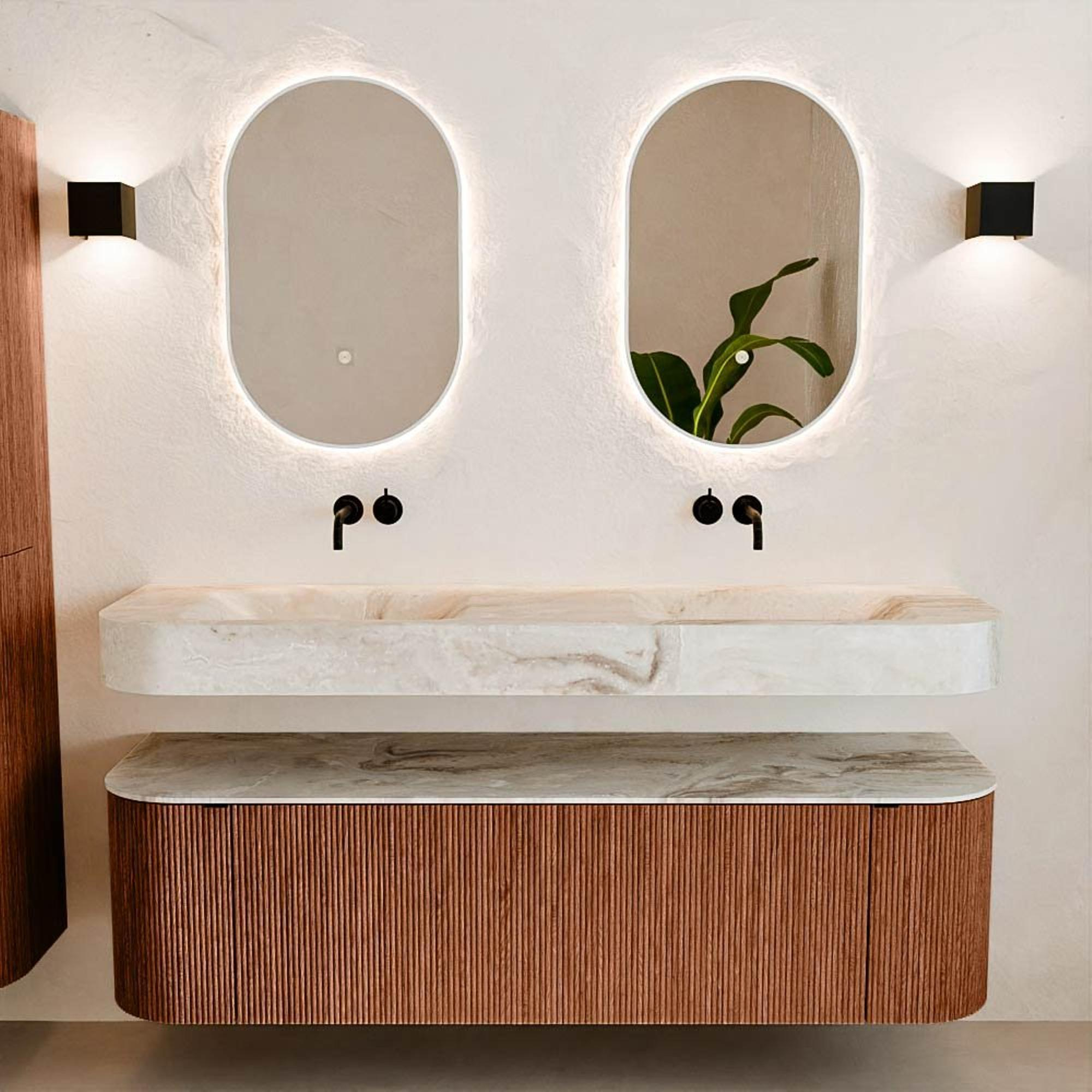 Natuurlijke materialen in warme tinten. De verticale ribbels brengen ritme en textuur in het ontwerp, terwijl het eikenhout zorgt voor een warme, ambachtelijke uitstraling. Kies uit 5 houttinten OAK, WALNUT, DUSK, SHADOW en RUBY zorgvuldig geselecteerde houtkleuren om zowel moderne als klassieke badkamers te verrijken.