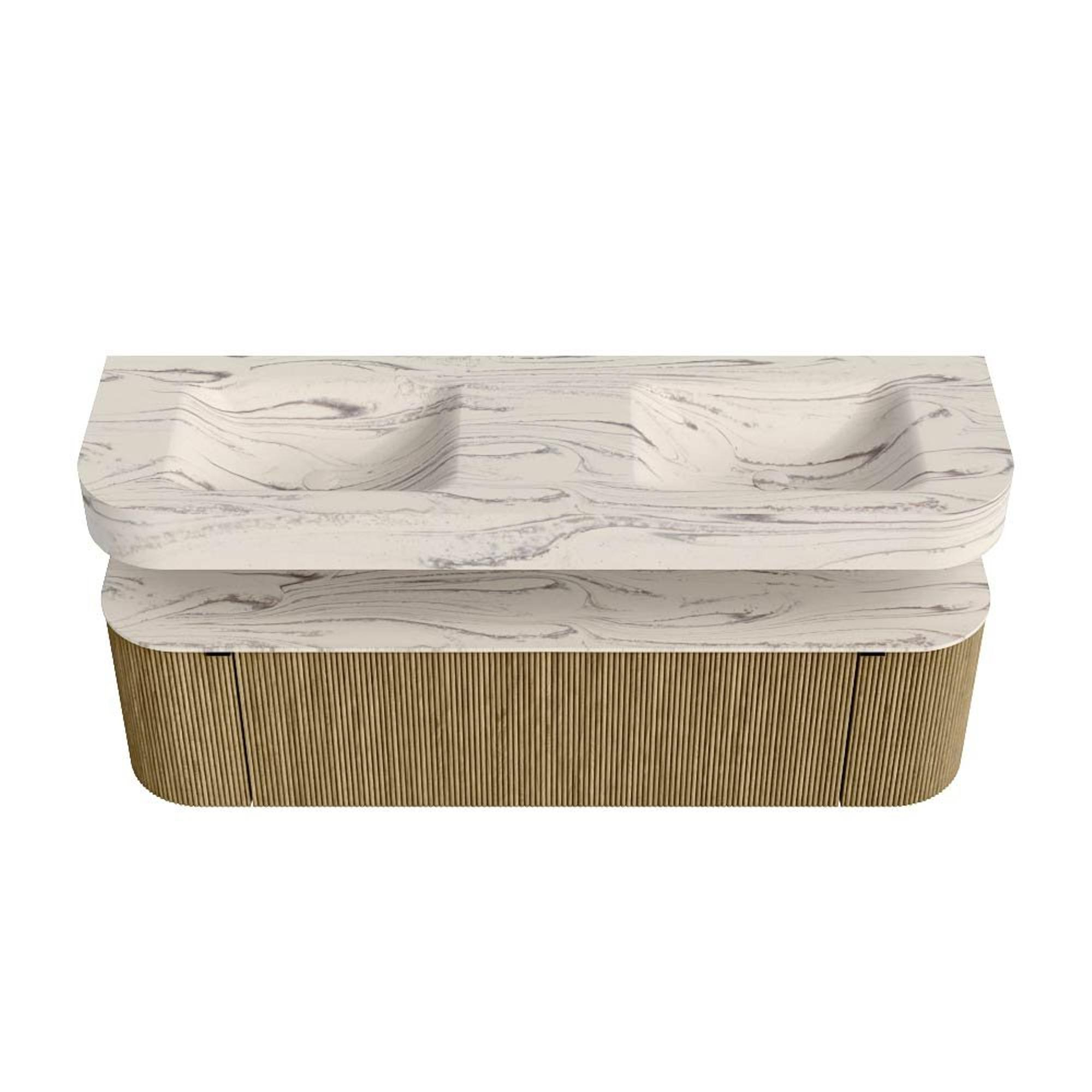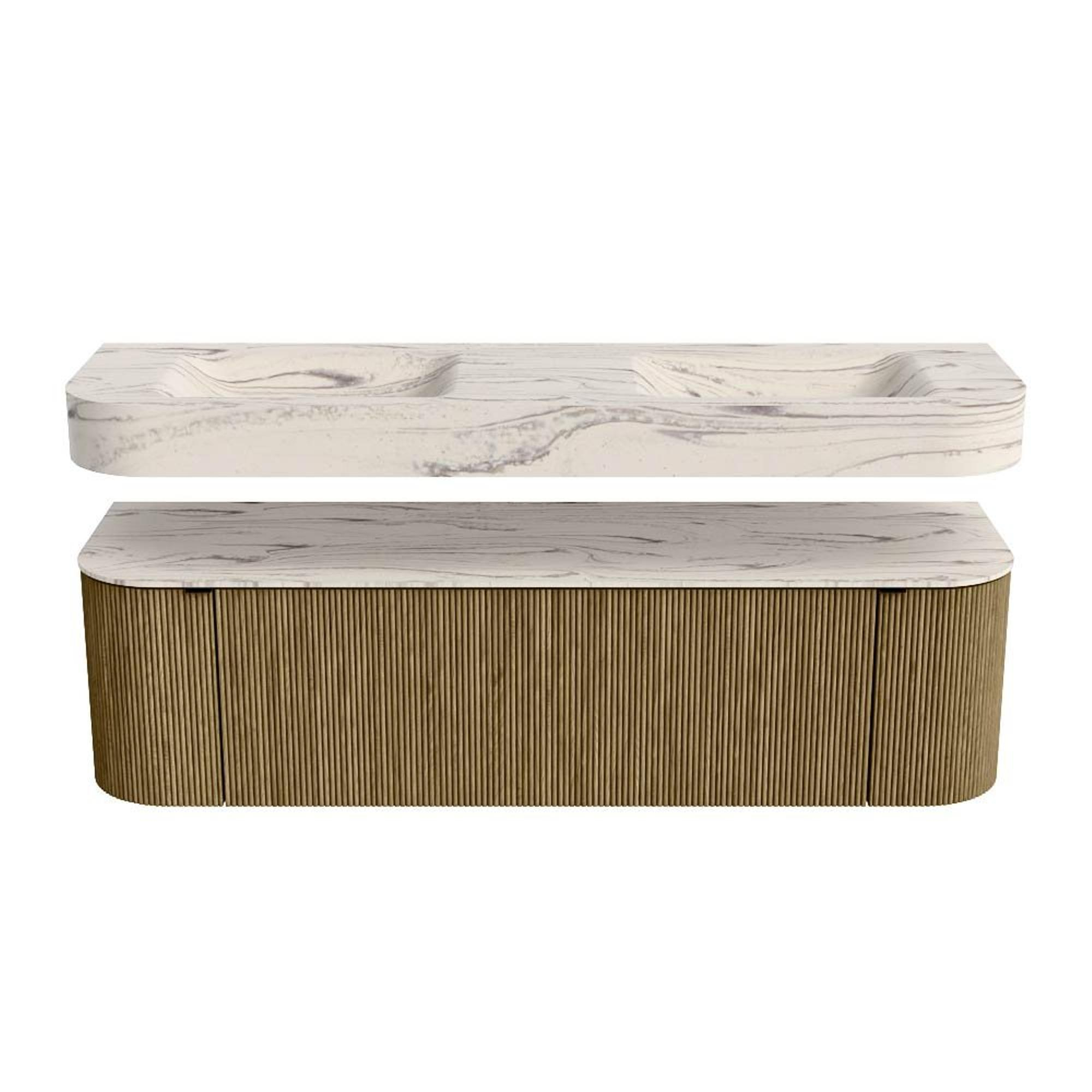 Boven het meubel zweeft een bijpassende, vrij hangende wastafel met afgeronde hoeken – perfect afgestemd op de vorm van de kast. De wastafel is uitgevoerd in Solid Surface en volgt subtiel de lijnen van het onderliggende meubel, waardoor een harmonieus geheel ontstaat. Het Solid Surface topblad vormt een sterke, onderhoudsvriendelijke basis en maakt de combinatie compleet.