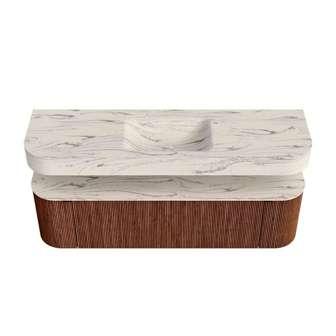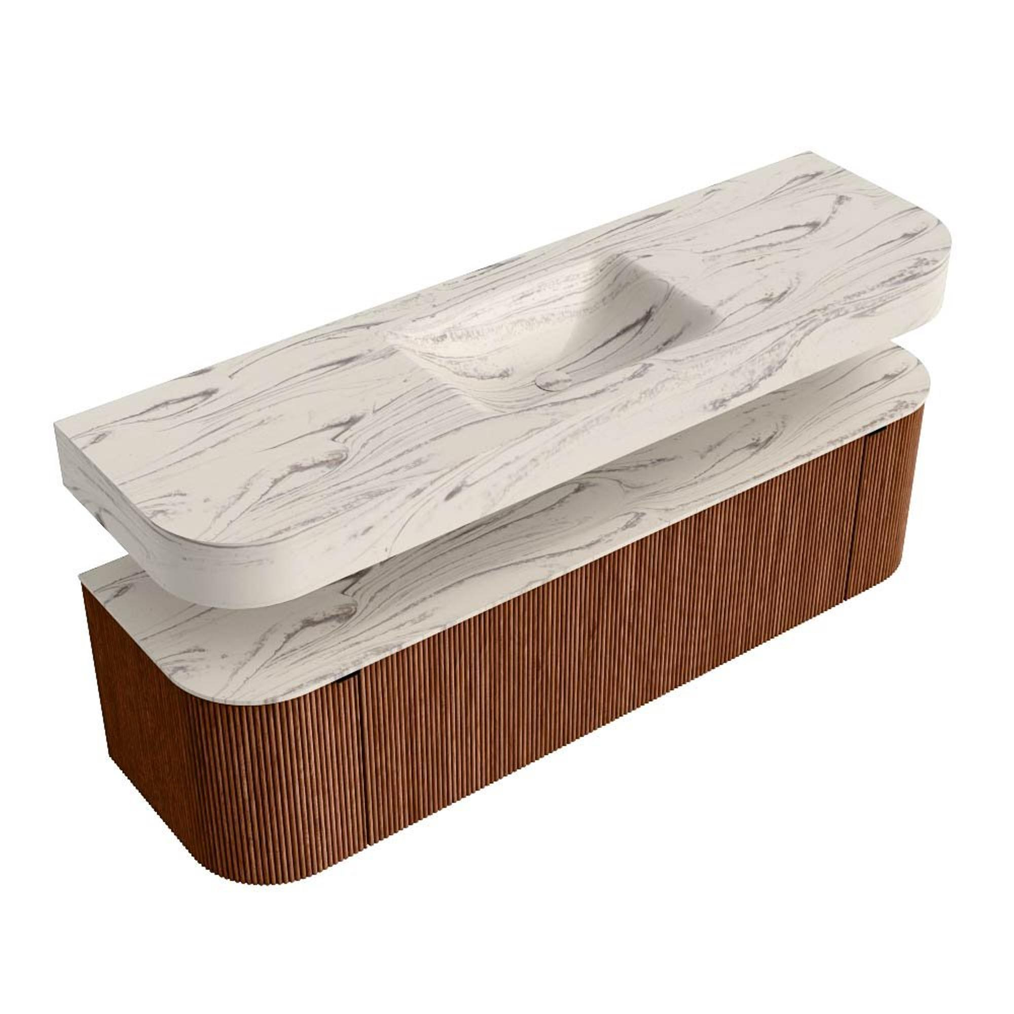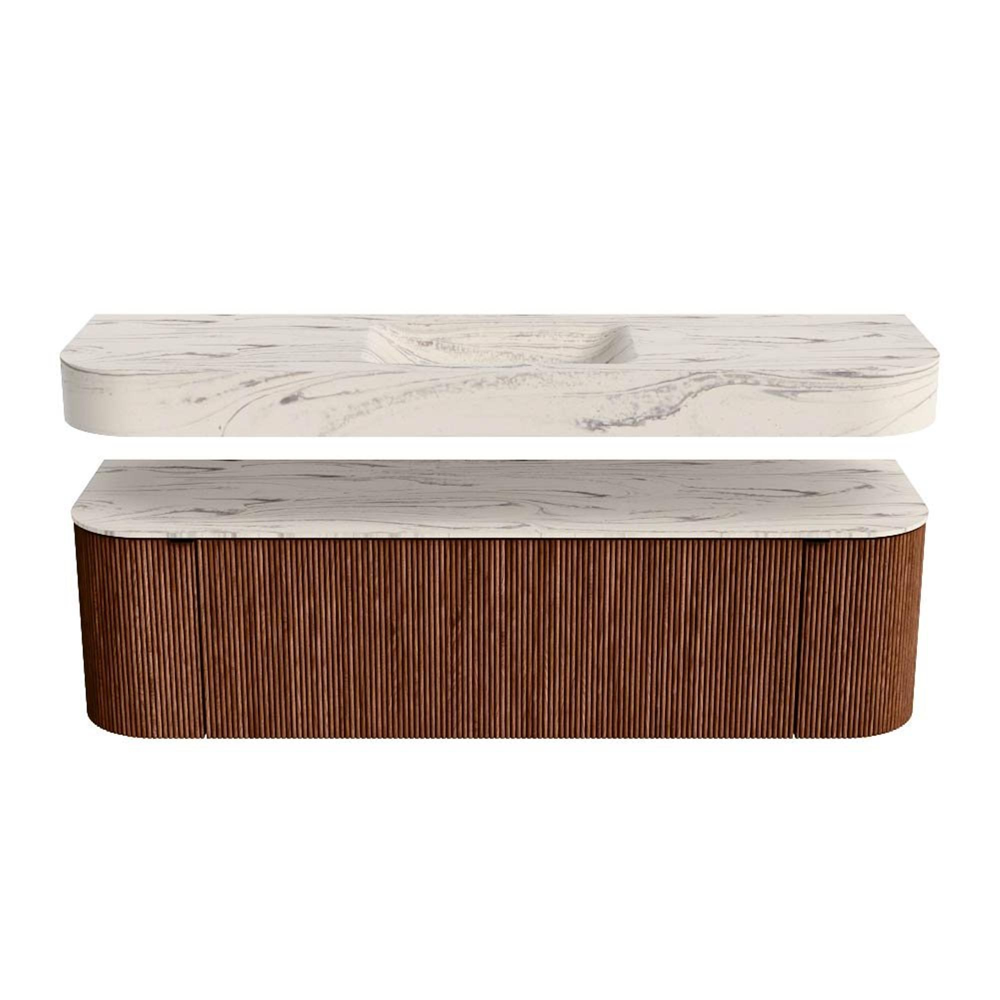 Boven het meubel zweeft een bijpassende, vrij hangende wastafel met afgeronde hoeken – perfect afgestemd op de vorm van de kast. De wastafel is uitgevoerd in Solid Surface en volgt subtiel de lijnen van het onderliggende meubel, waardoor een harmonieus geheel ontstaat. Het Solid Surface topblad vormt een sterke, onderhoudsvriendelijke basis en maakt de combinatie compleet.