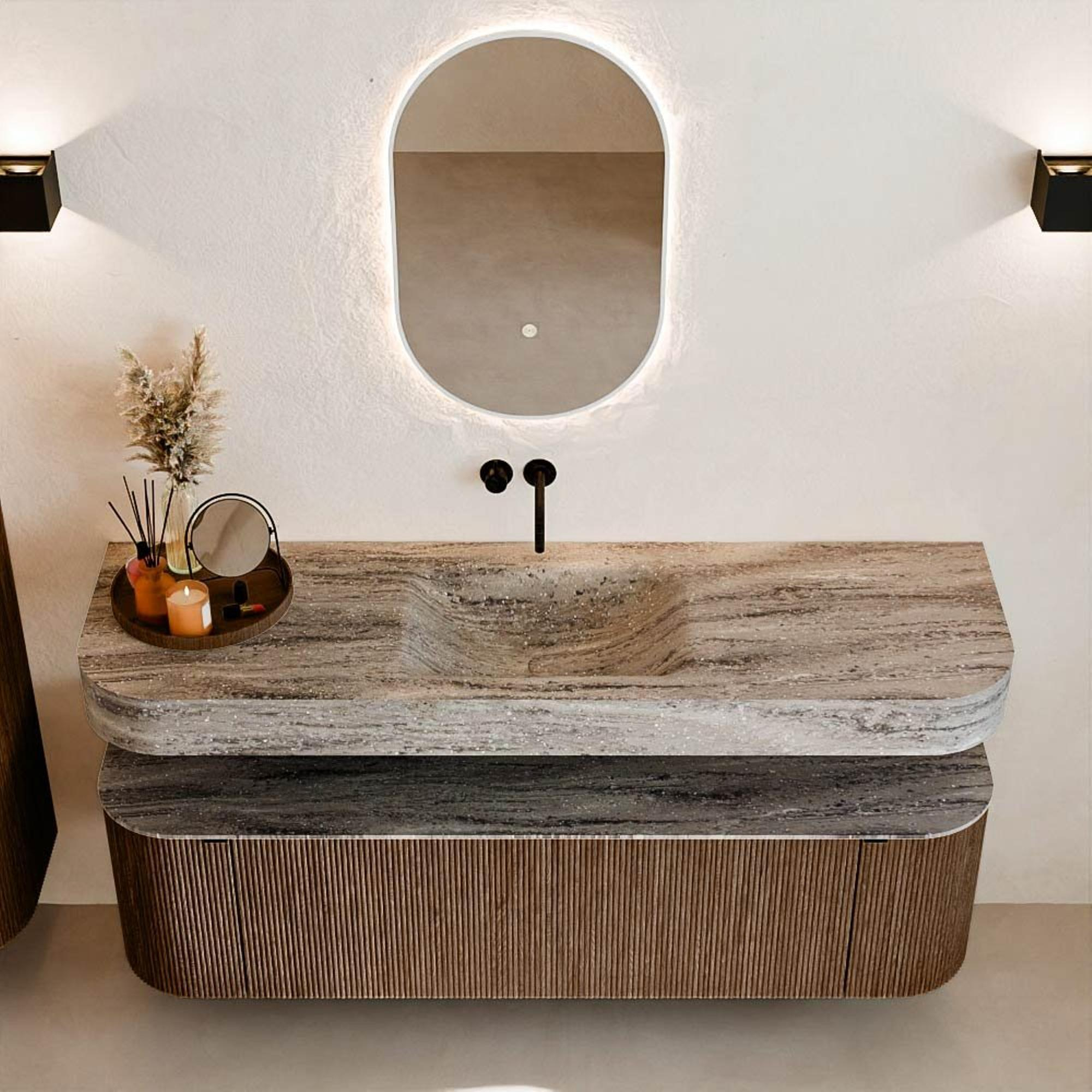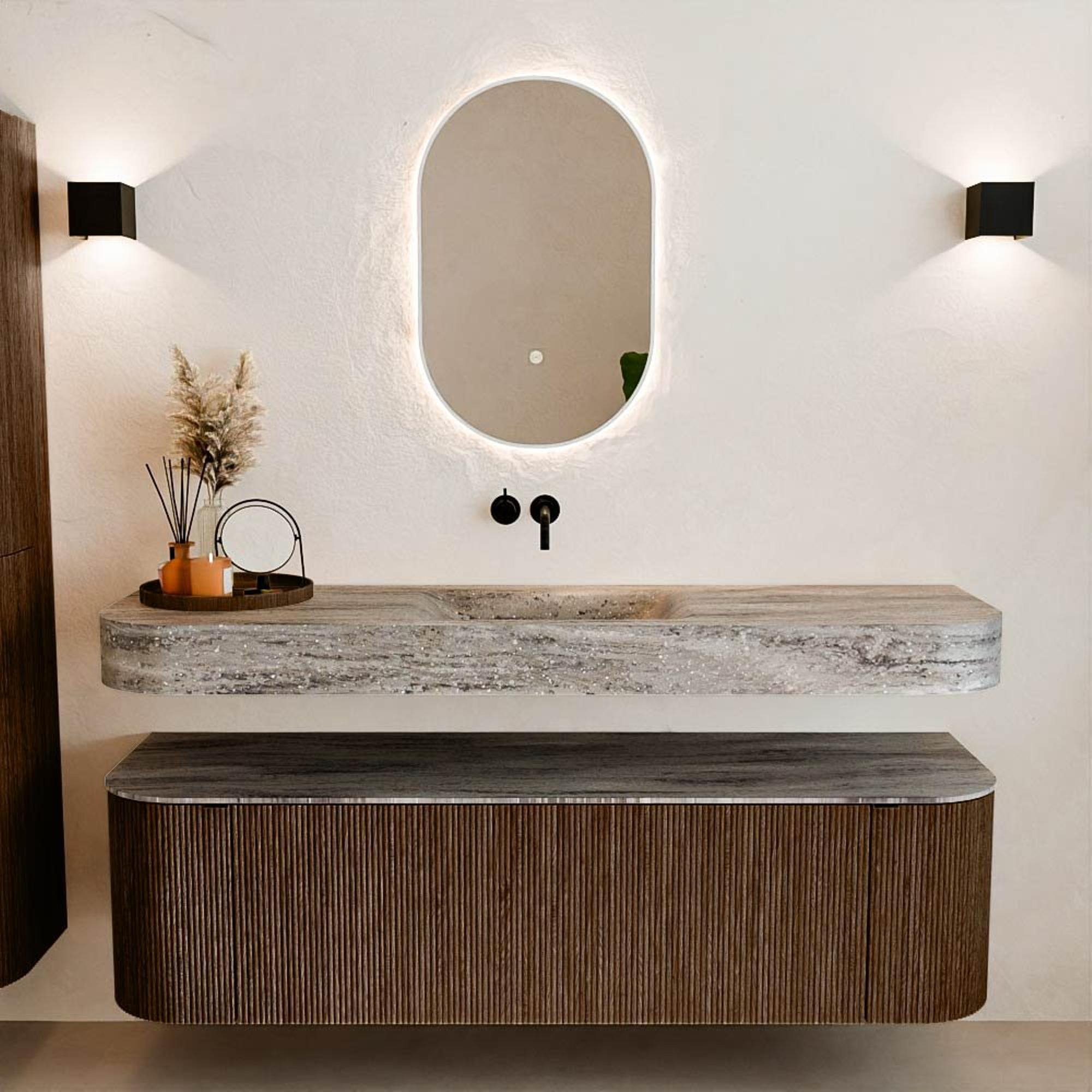 Natuurlijke materialen in warme tinten. De verticale ribbels brengen ritme en textuur in het ontwerp, terwijl het eikenhout zorgt voor een warme, ambachtelijke uitstraling. Kies uit 5 houttinten OAK, WALNUT, DUSK, SHADOW en RUBY zorgvuldig geselecteerde houtkleuren om zowel moderne als klassieke badkamers te verrijken.