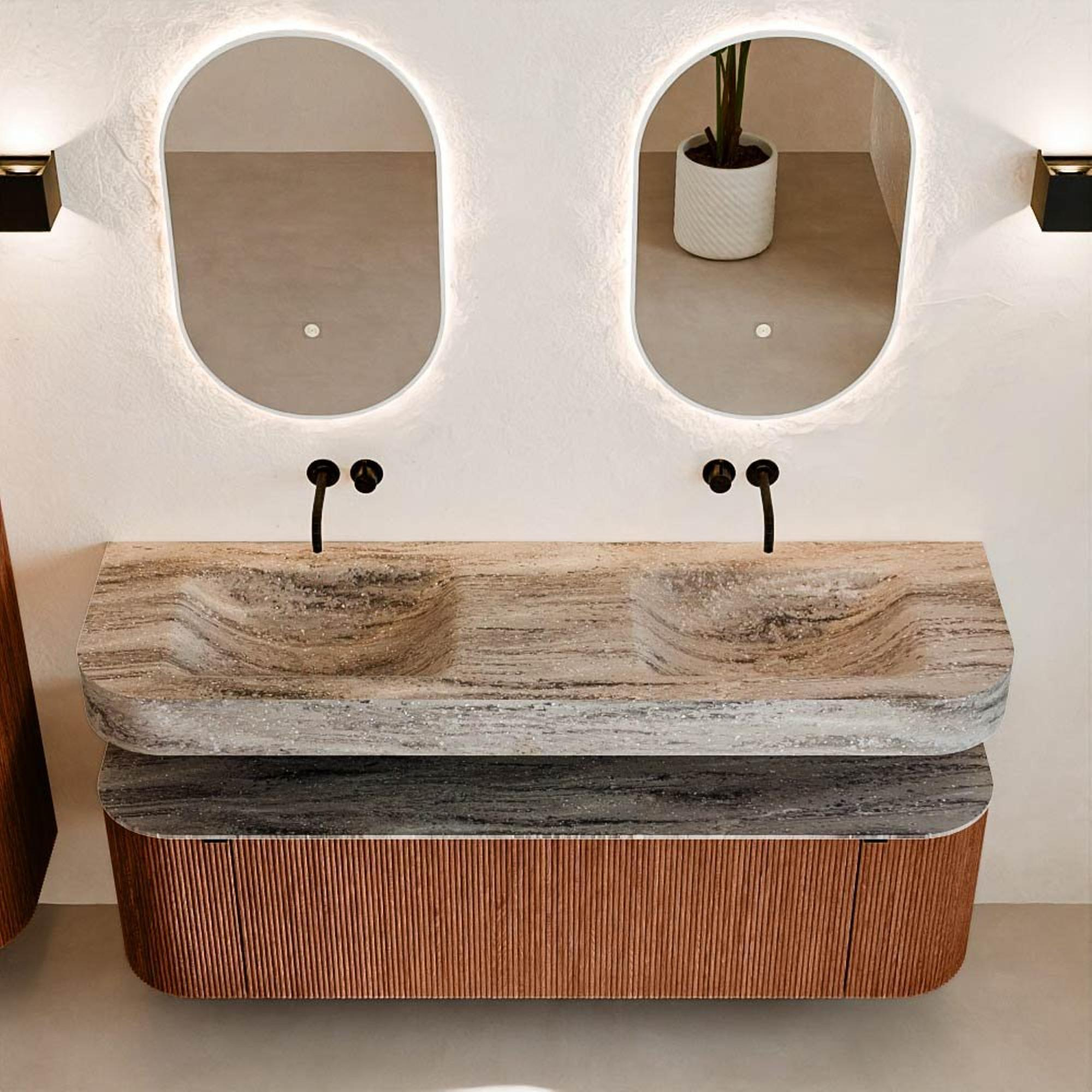 Natuurlijke materialen in warme tinten. De verticale ribbels brengen ritme en textuur in het ontwerp, terwijl het eikenhout zorgt voor een warme, ambachtelijke uitstraling. Kies uit 5 houttinten OAK, WALNUT, DUSK, SHADOW en RUBY zorgvuldig geselecteerde houtkleuren om zowel moderne als klassieke badkamers te verrijken.