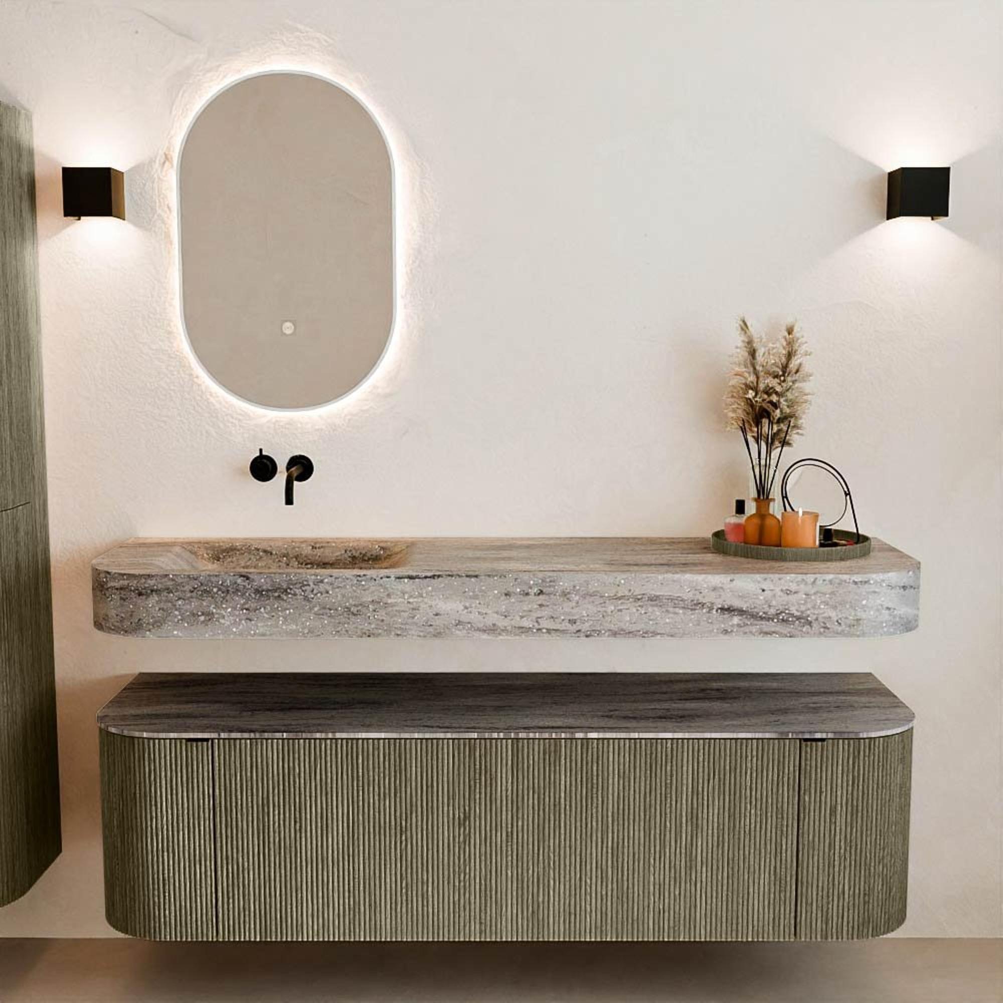 Natuurlijke materialen in warme tinten. De verticale ribbels brengen ritme en textuur in het ontwerp, terwijl het eikenhout zorgt voor een warme, ambachtelijke uitstraling. Kies uit 5 houttinten OAK, WALNUT, DUSK, SHADOW en RUBY zorgvuldig geselecteerde houtkleuren om zowel moderne als klassieke badkamers te verrijken.