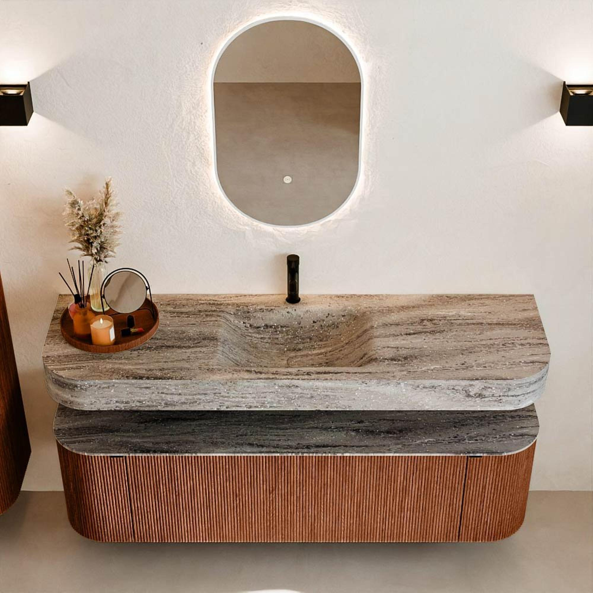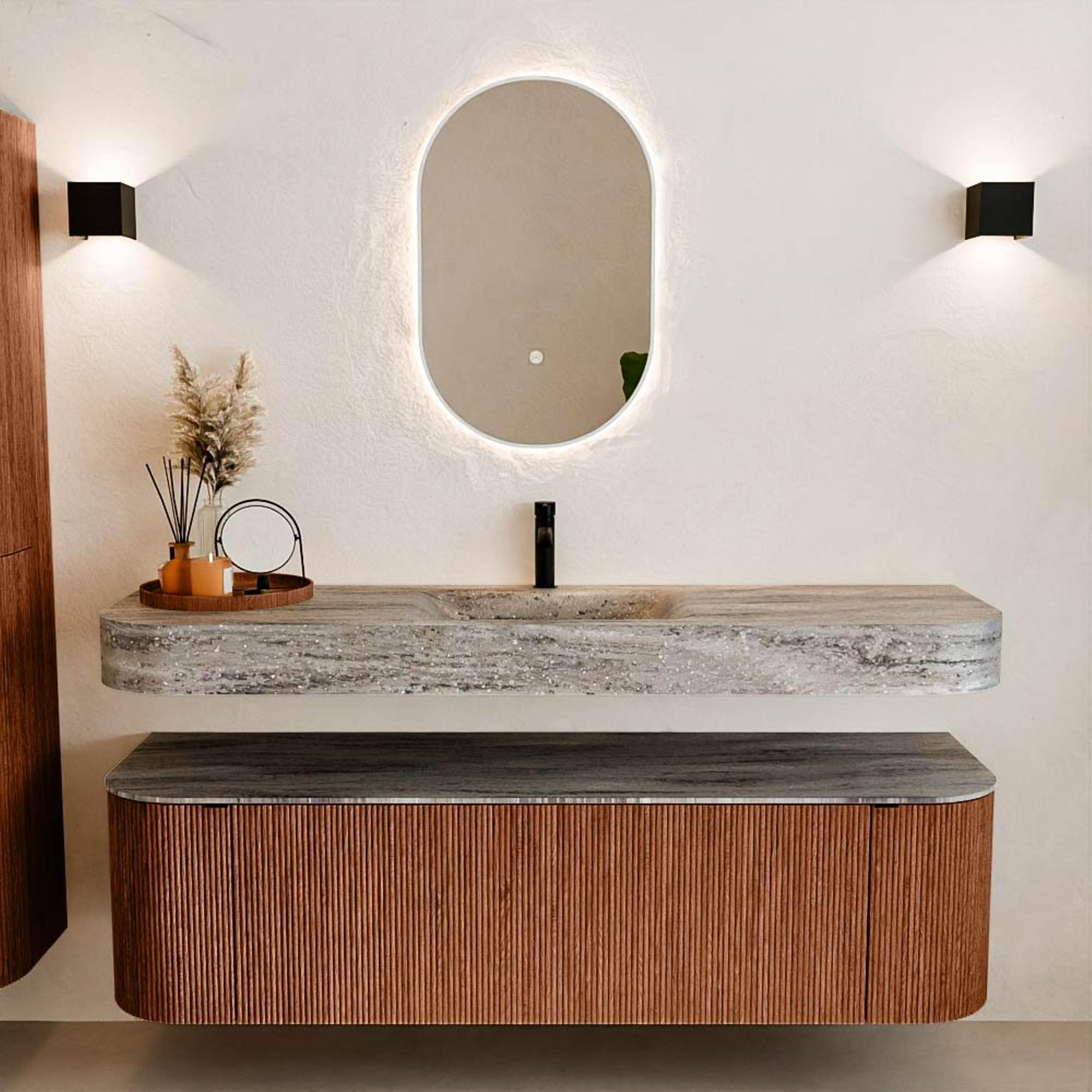 Natuurlijke materialen in warme tinten. De verticale ribbels brengen ritme en textuur in het ontwerp, terwijl het eikenhout zorgt voor een warme, ambachtelijke uitstraling. Kies uit 5 houttinten OAK, WALNUT, DUSK, SHADOW en RUBY zorgvuldig geselecteerde houtkleuren om zowel moderne als klassieke badkamers te verrijken.