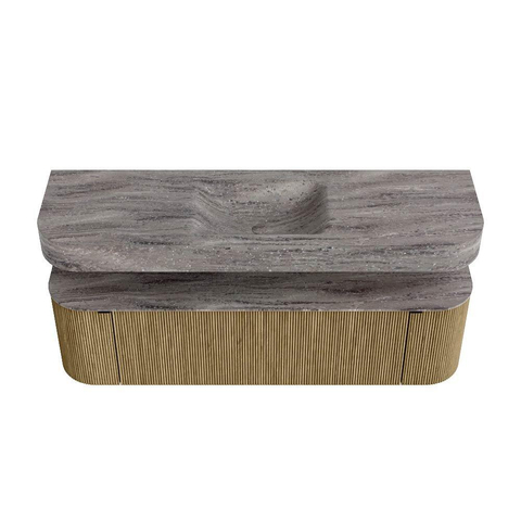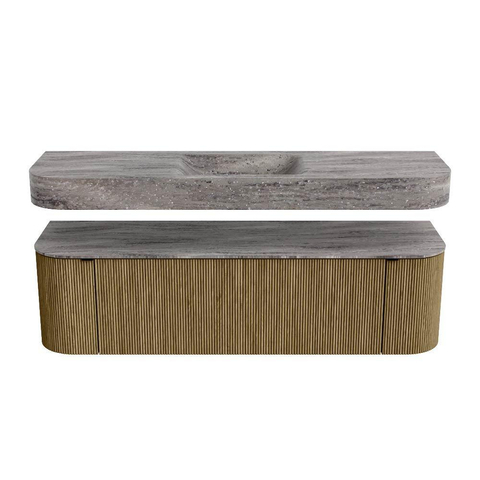 Boven het meubel zweeft een bijpassende, vrij hangende wastafel met afgeronde hoeken – perfect afgestemd op de vorm van de kast. De wastafel is uitgevoerd in Solid Surface en volgt subtiel de lijnen van het onderliggende meubel, waardoor een harmonieus geheel ontstaat. Het Solid Surface topblad vormt een sterke, onderhoudsvriendelijke basis en maakt de combinatie compleet.
