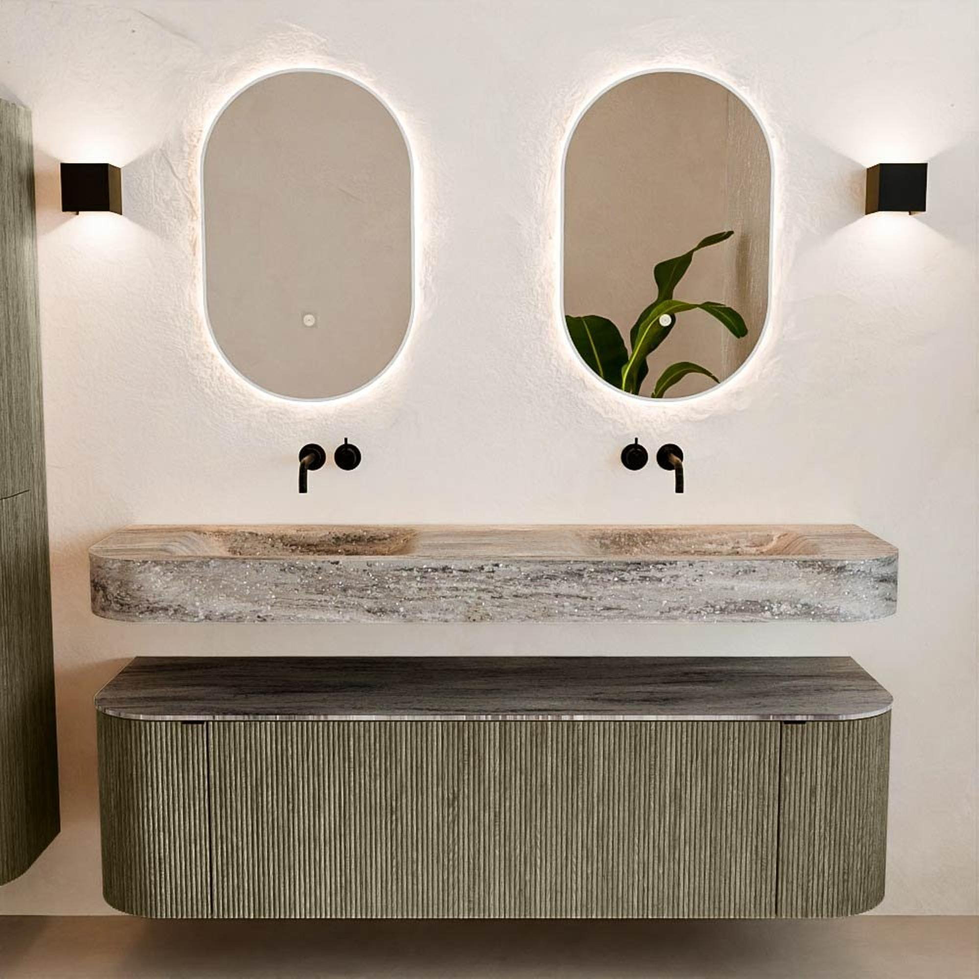 Natuurlijke materialen in warme tinten. De verticale ribbels brengen ritme en textuur in het ontwerp, terwijl het eikenhout zorgt voor een warme, ambachtelijke uitstraling. Kies uit 5 houttinten OAK, WALNUT, DUSK, SHADOW en RUBY zorgvuldig geselecteerde houtkleuren om zowel moderne als klassieke badkamers te verrijken.