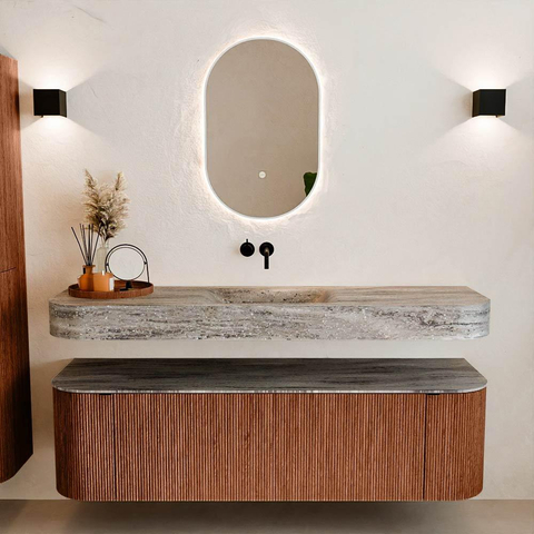 Natuurlijke materialen in warme tinten. De verticale ribbels brengen ritme en textuur in het ontwerp, terwijl het eikenhout zorgt voor een warme, ambachtelijke uitstraling. Kies uit 5 houttinten OAK, WALNUT, DUSK, SHADOW en RUBY zorgvuldig geselecteerde houtkleuren om zowel moderne als klassieke badkamers te verrijken.
