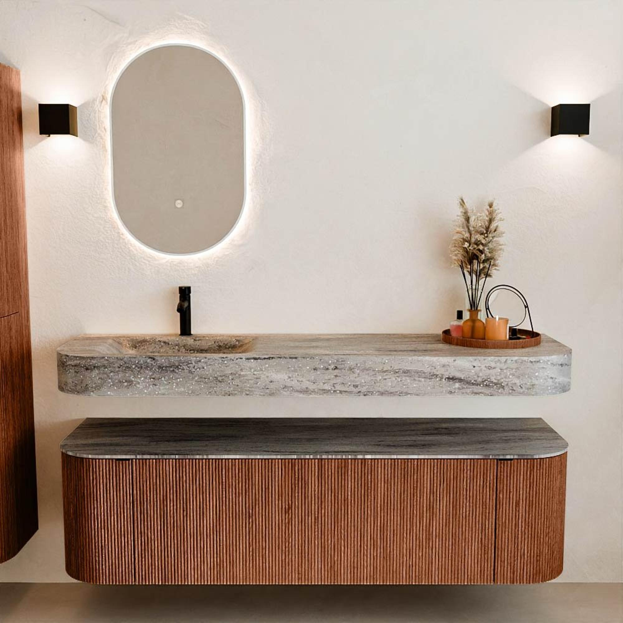 Natuurlijke materialen in warme tinten. De verticale ribbels brengen ritme en textuur in het ontwerp, terwijl het eikenhout zorgt voor een warme, ambachtelijke uitstraling. Kies uit 5 houttinten OAK, WALNUT, DUSK, SHADOW en RUBY zorgvuldig geselecteerde houtkleuren om zowel moderne als klassieke badkamers te verrijken.