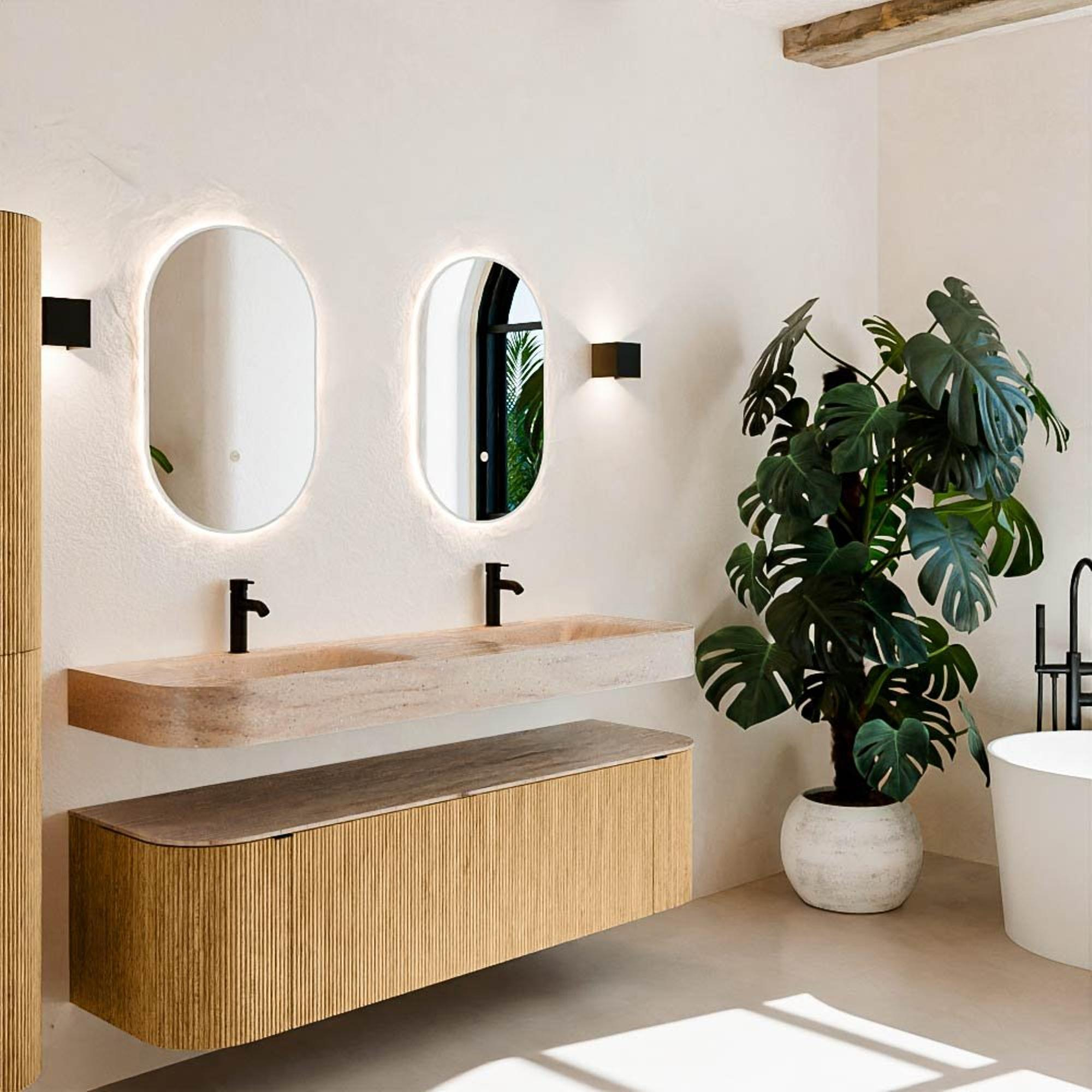 Natuurlijke materialen in warme tinten. De verticale ribbels brengen ritme en textuur in het ontwerp, terwijl het eikenhout zorgt voor een warme, ambachtelijke uitstraling. Kies uit 5 houttinten OAK, WALNUT, DUSK, SHADOW en RUBY zorgvuldig geselecteerde houtkleuren om zowel moderne als klassieke badkamers te verrijken.