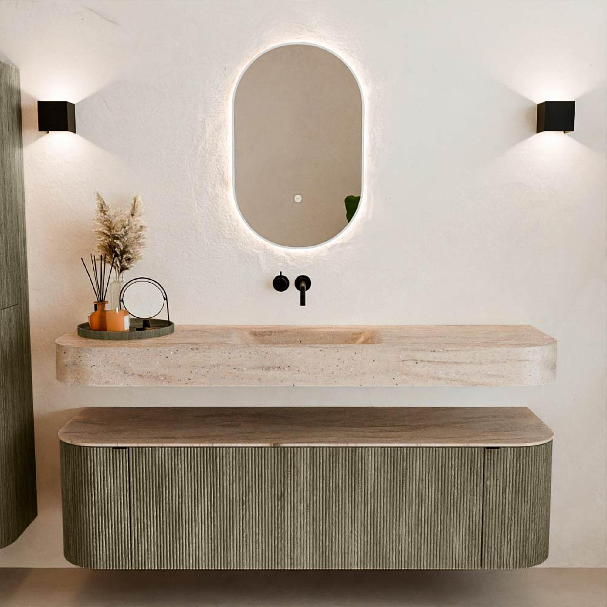 Natuurlijke materialen in warme tinten. De verticale ribbels brengen ritme en textuur in het ontwerp, terwijl het eikenhout zorgt voor een warme, ambachtelijke uitstraling. Kies uit 5 houttinten OAK, WALNUT, DUSK, SHADOW en RUBY zorgvuldig geselecteerde houtkleuren om zowel moderne als klassieke badkamers te verrijken.