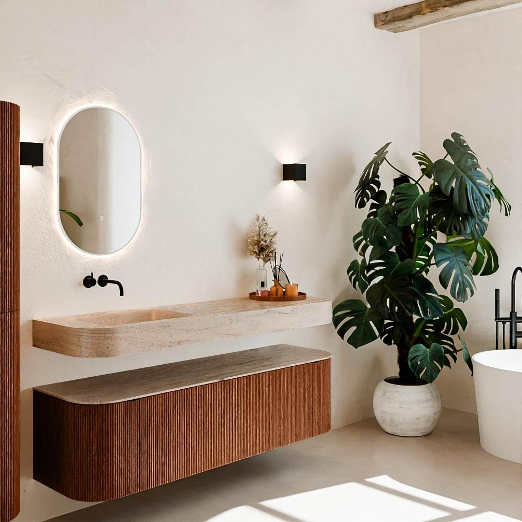 Natuurlijke materialen in warme tinten. De verticale ribbels brengen ritme en textuur in het ontwerp, terwijl het eikenhout zorgt voor een warme, ambachtelijke uitstraling. Kies uit 5 houttinten OAK, WALNUT, DUSK, SHADOW en RUBY zorgvuldig geselecteerde houtkleuren om zowel moderne als klassieke badkamers te verrijken.