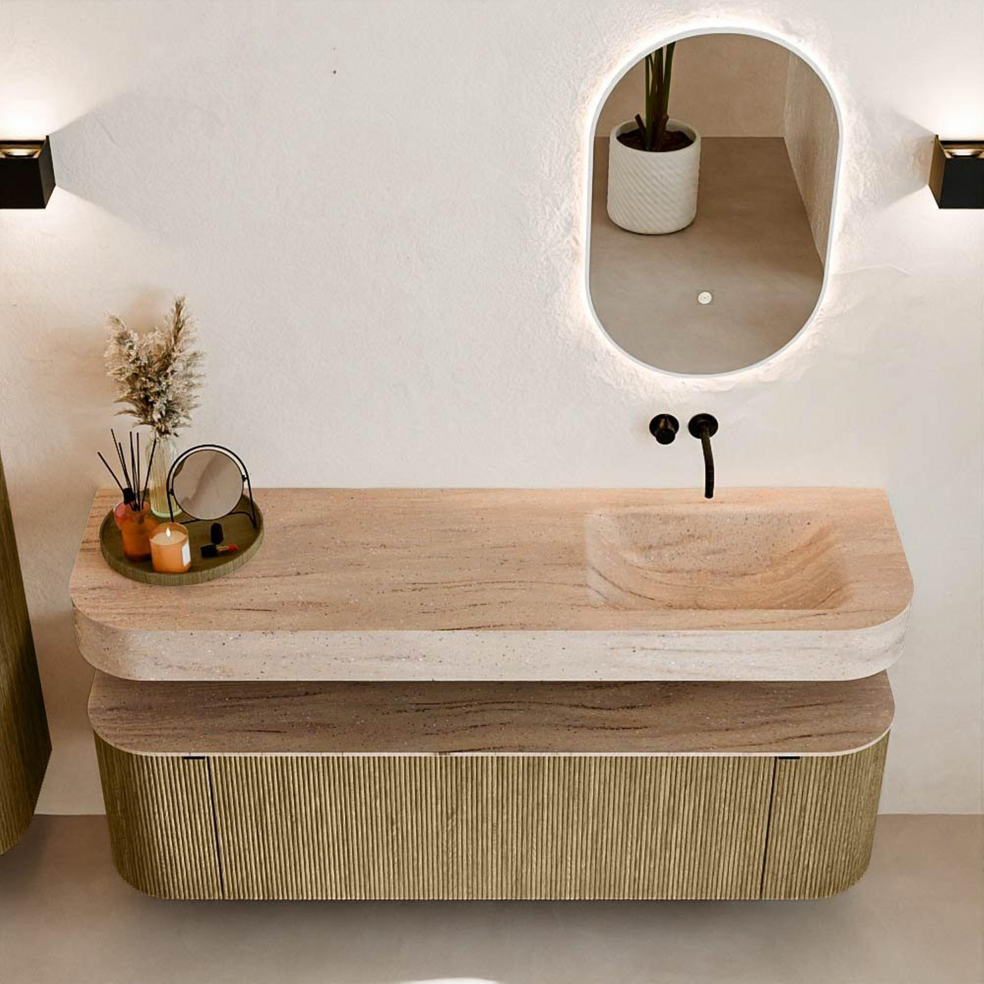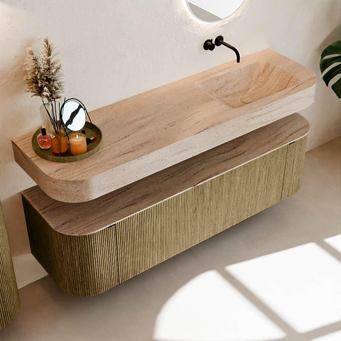 Natuurlijke materialen in warme tinten. De verticale ribbels brengen ritme en textuur in het ontwerp, terwijl het eikenhout zorgt voor een warme, ambachtelijke uitstraling. Kies uit 5 houttinten OAK, WALNUT, DUSK, SHADOW en RUBY zorgvuldig geselecteerde houtkleuren om zowel moderne als klassieke badkamers te verrijken.