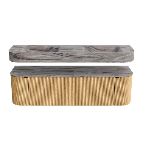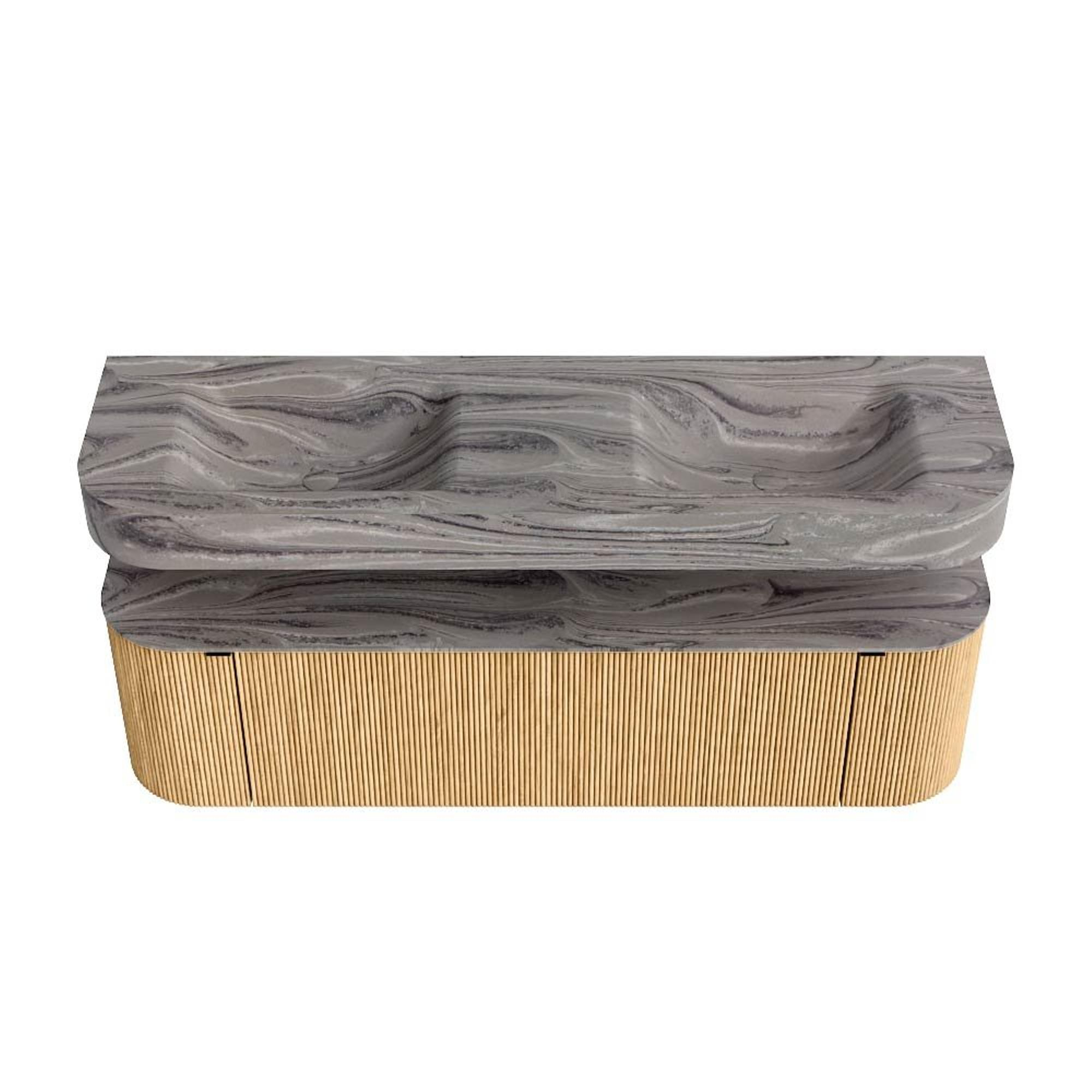 MONDIAZ THOR-DLUX 160cm badmeubel ronding links + rechts kleur Oak met 1 lade en 2 deuren. Vrijhangende wastafel CLOUD Dubbel zonder kraangat kleur Sombra.