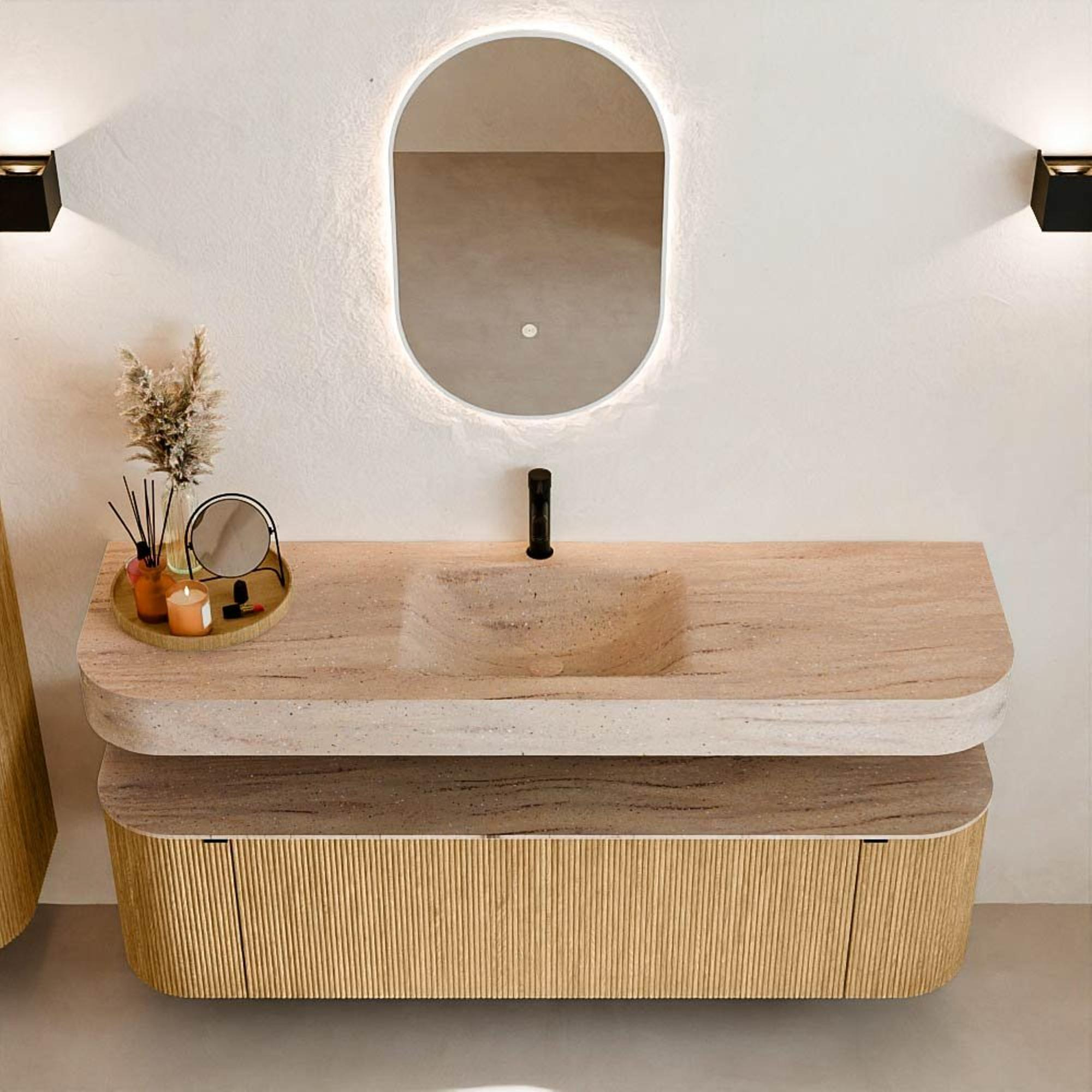 Natuurlijke materialen in warme tinten. De verticale ribbels brengen ritme en textuur in het ontwerp, terwijl het eikenhout zorgt voor een warme, ambachtelijke uitstraling. Kies uit 5 houttinten OAK, WALNUT, DUSK, SHADOW en RUBY zorgvuldig geselecteerde houtkleuren om zowel moderne als klassieke badkamers te verrijken.