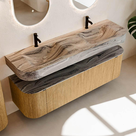 Natuurlijke materialen in warme tinten. De verticale ribbels brengen ritme en textuur in het ontwerp, terwijl het eikenhout zorgt voor een warme, ambachtelijke uitstraling. Kies uit 5 houttinten OAK, WALNUT, DUSK, SHADOW en RUBY zorgvuldig geselecteerde houtkleuren om zowel moderne als klassieke badkamers te verrijken.