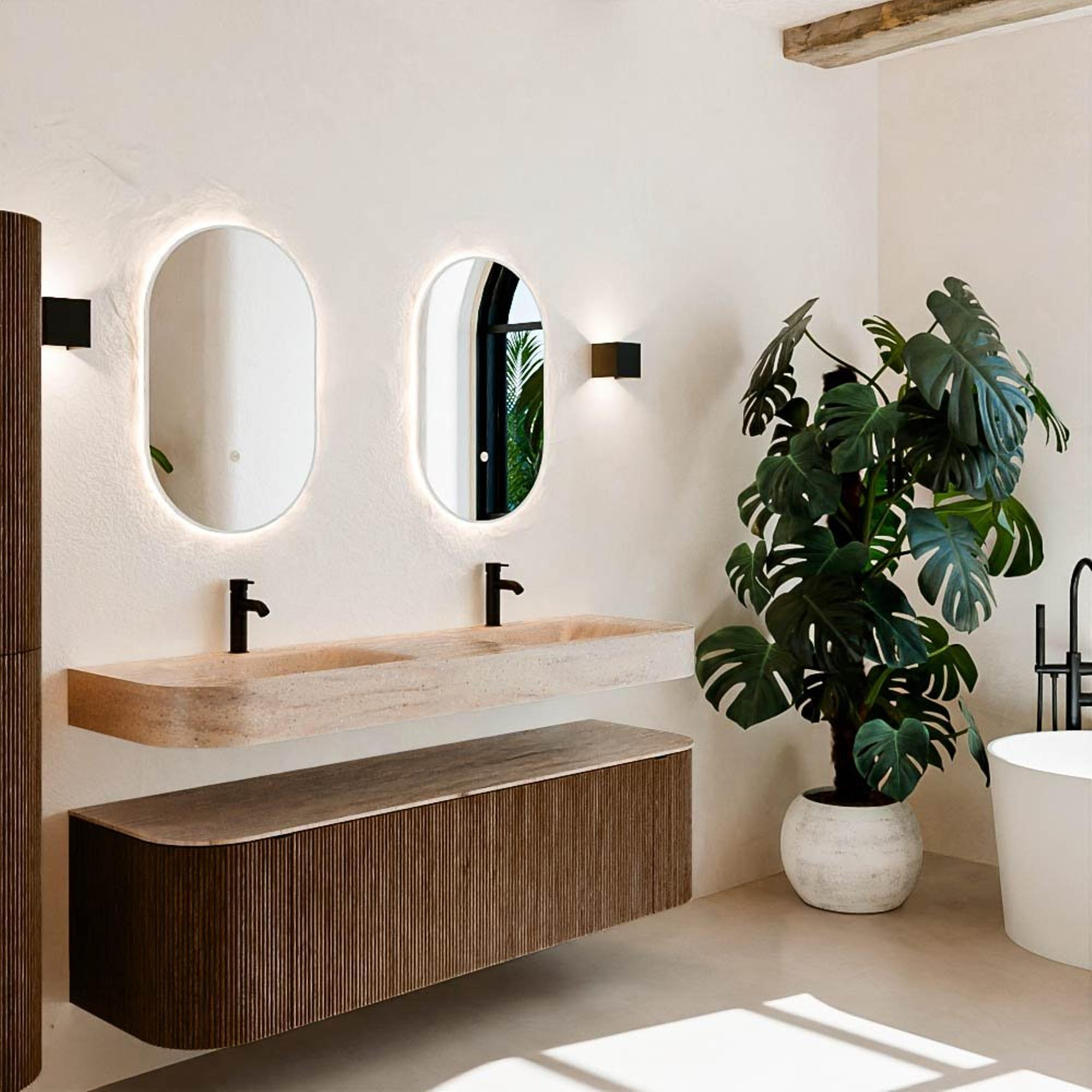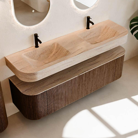 Natuurlijke materialen in warme tinten. De verticale ribbels brengen ritme en textuur in het ontwerp, terwijl het eikenhout zorgt voor een warme, ambachtelijke uitstraling. Kies uit 5 houttinten OAK, WALNUT, DUSK, SHADOW en RUBY zorgvuldig geselecteerde houtkleuren om zowel moderne als klassieke badkamers te verrijken.